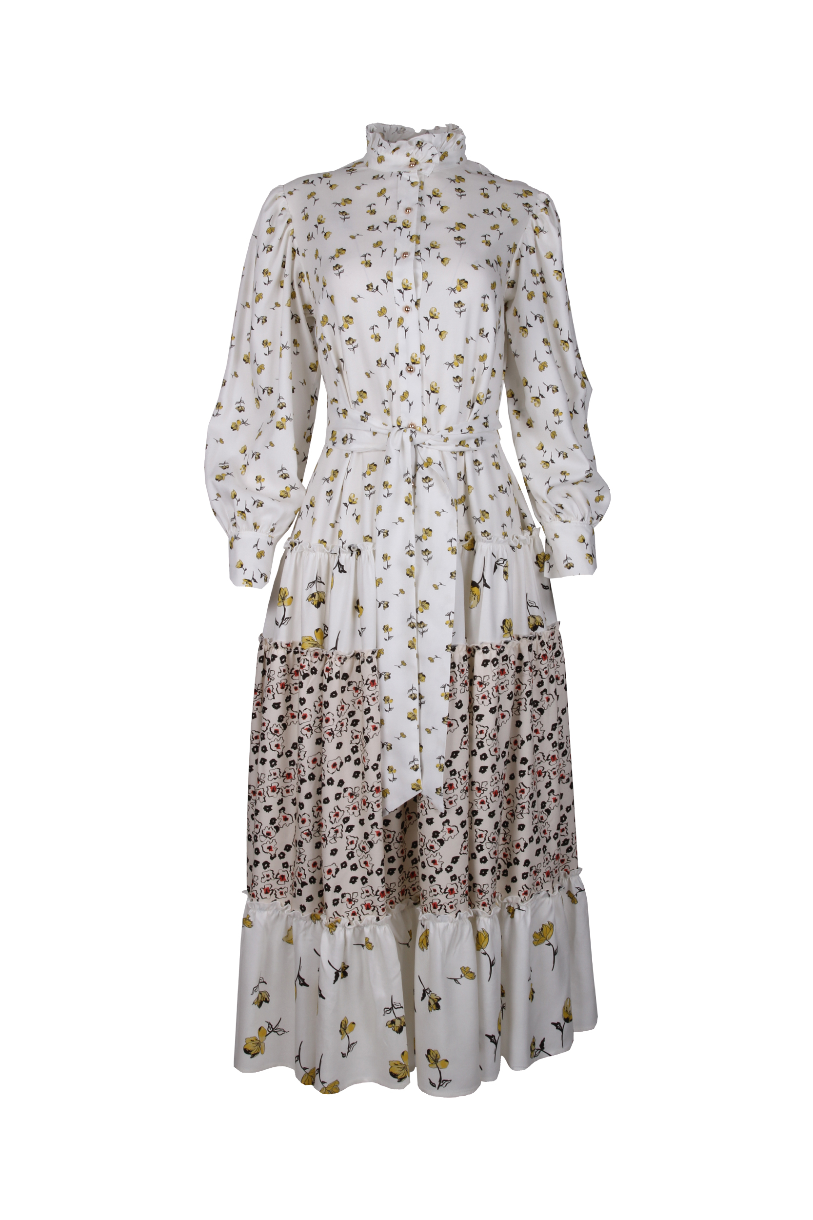 Vestido comprido , com padrão pradonizado , de manga comprida e gola subida