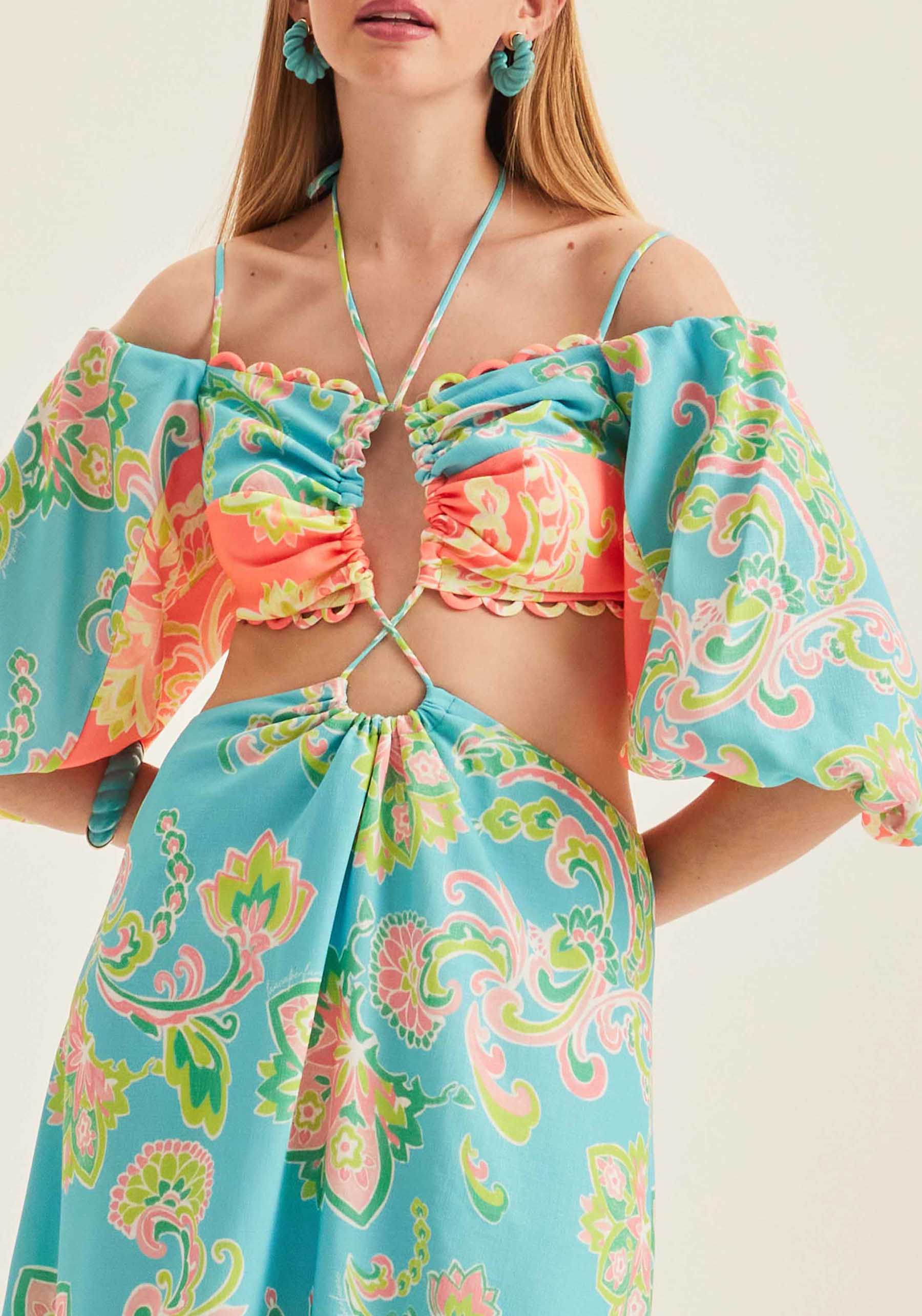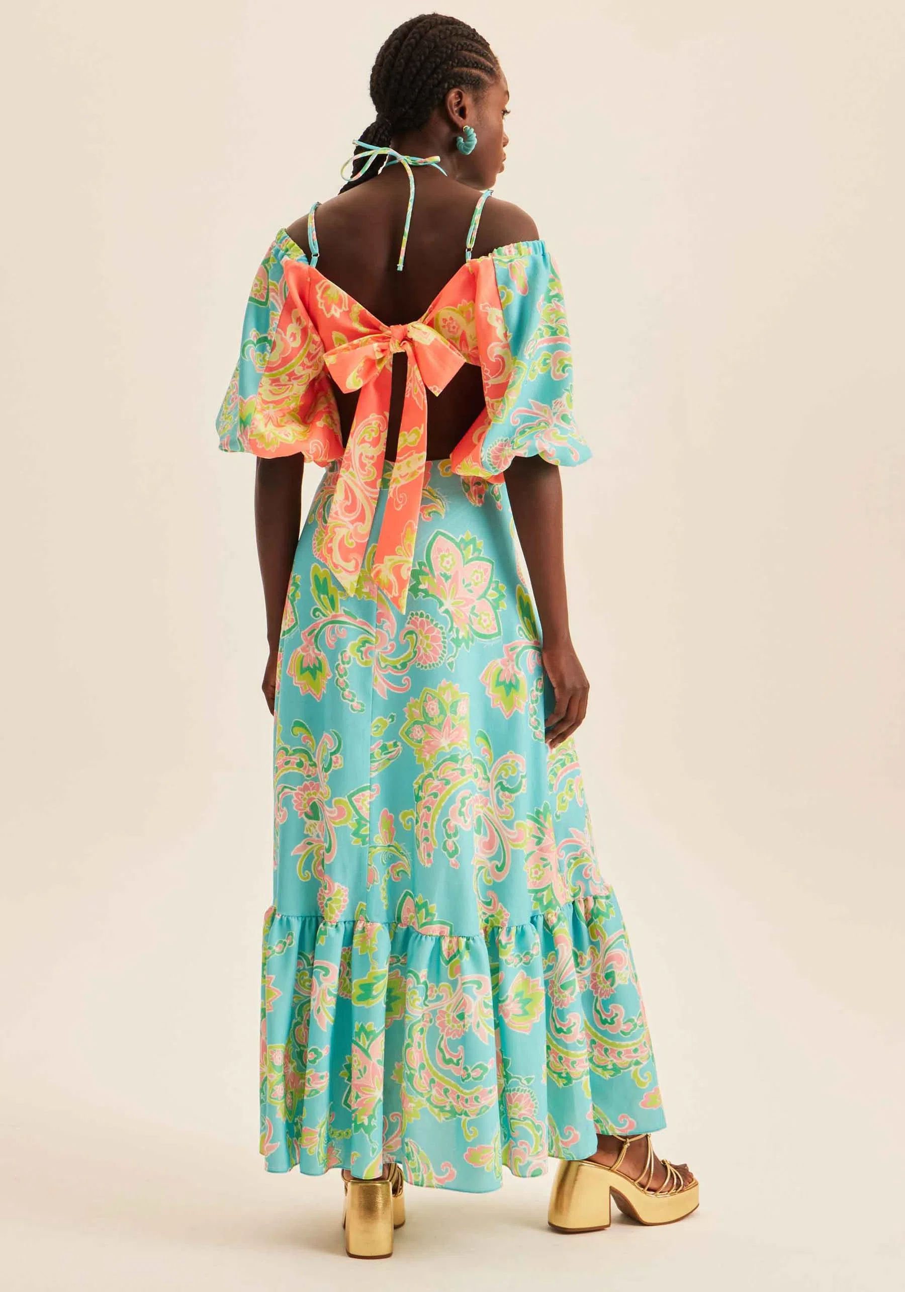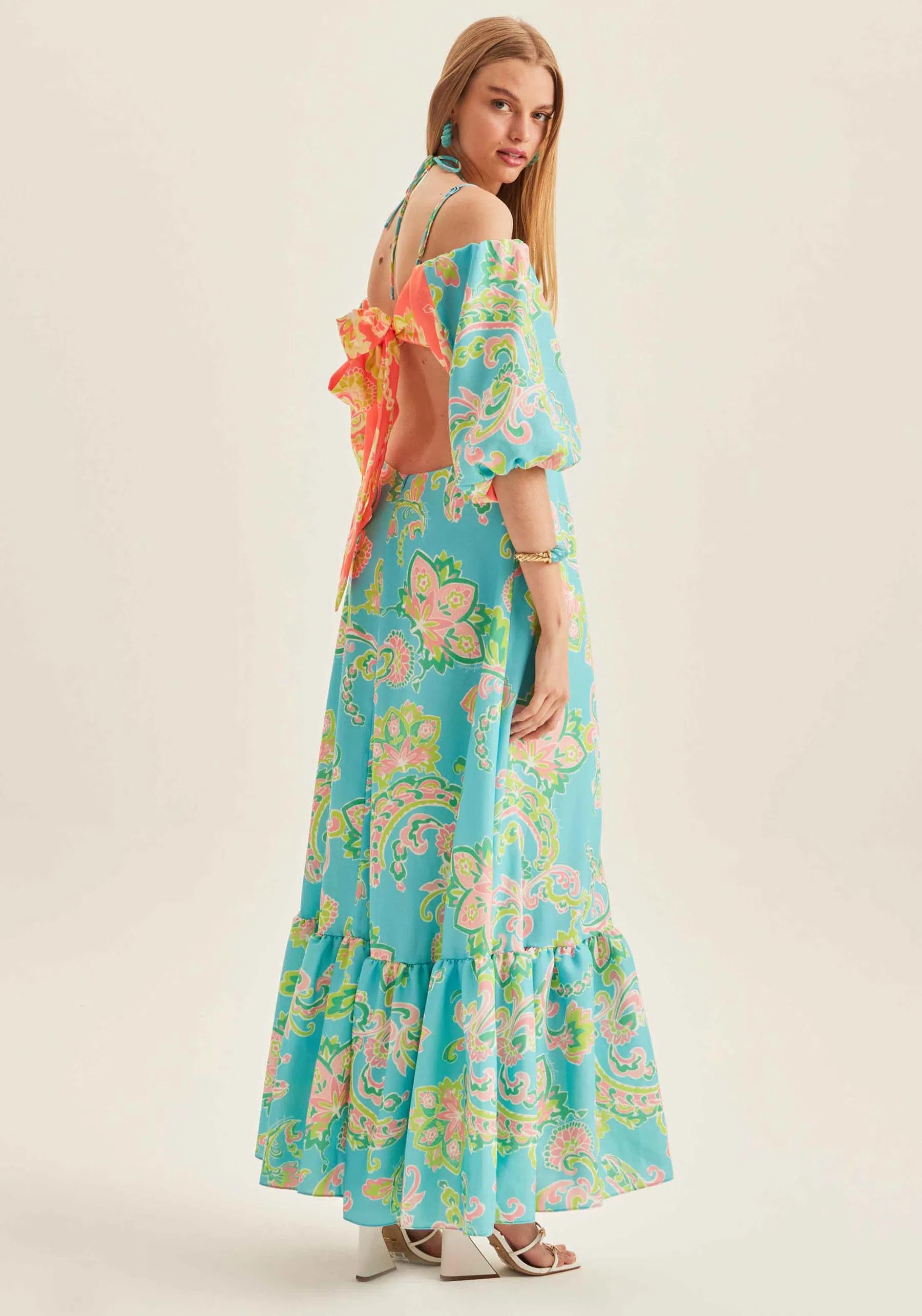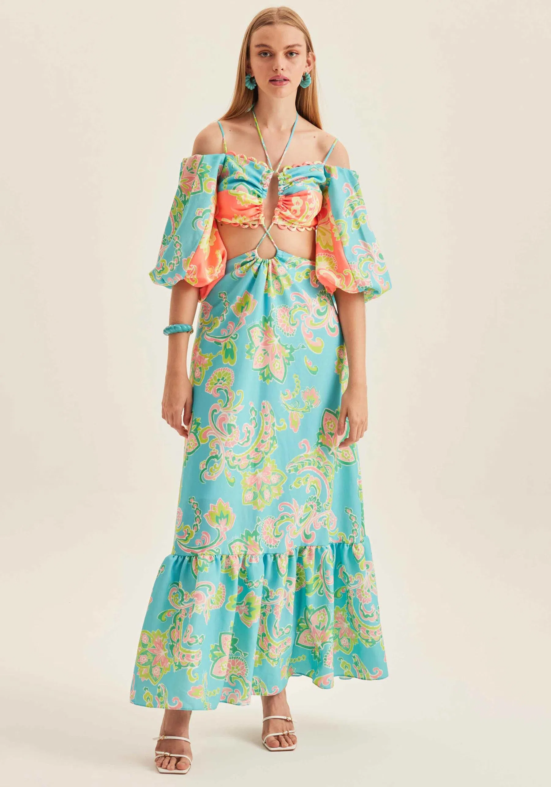 VESTIDO LONGO EM ESTILO CUT OFF APRESENTA CAIMENTO SOLTO E FLUÍDO. O ESTAMPADO PERSONALIZADO É UM CHARME A PARTE, ALÉM DAS MANGAS BUFANTES, BABADOS LEVES, TIRAS PARA AMARRAÇÃO E FECHAMENTO EM MAXI LAÇO POSTERIOR. UM VESTIDO QUE CABE BEM EM DIVERSAS OCASIÕES.