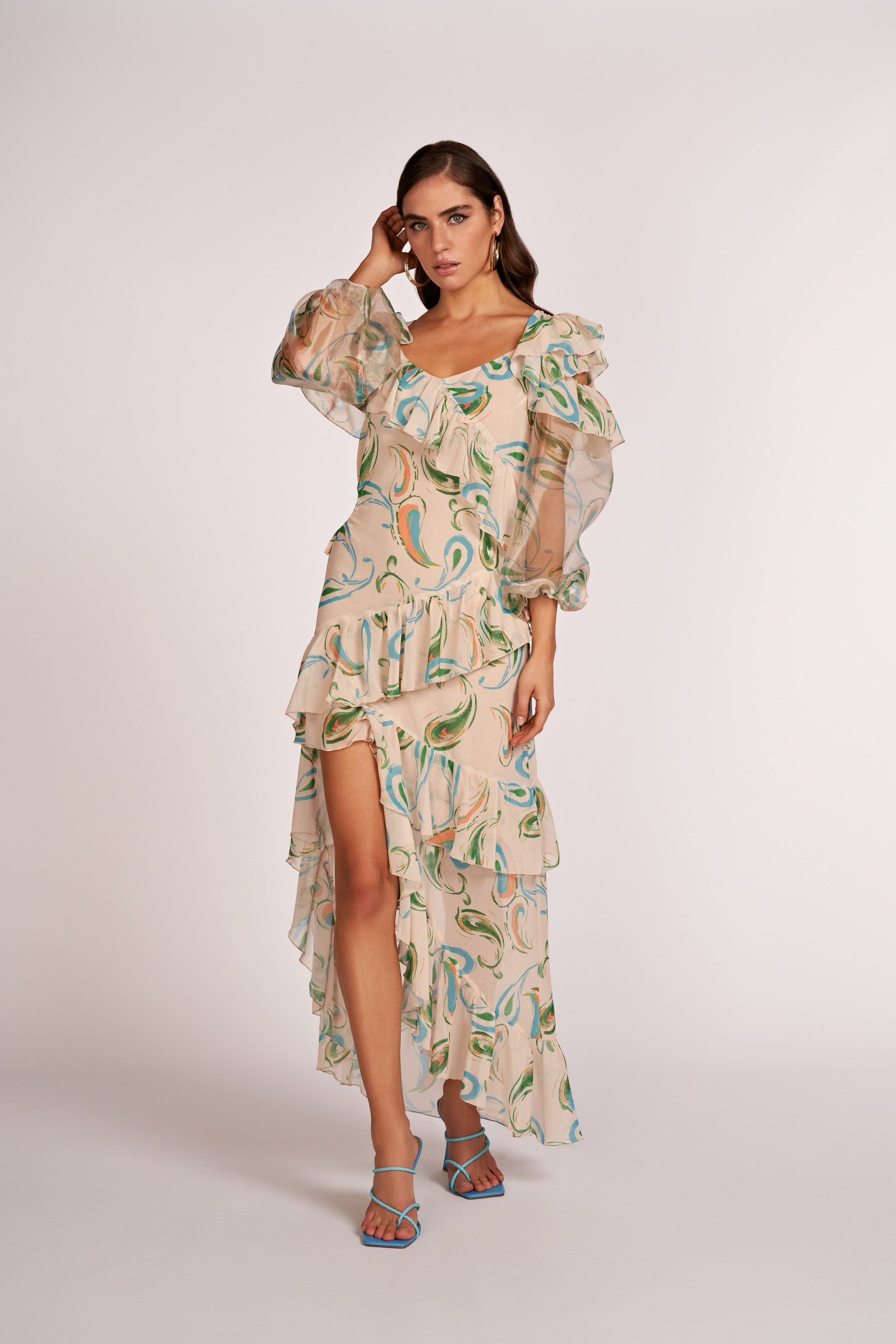 Vestido comprido de mangas compridas abaloadas transpararentes. Folhos nos ombros, na zona do decote e ao longo do vestido. Decote em V à frente e atrás. Pormenor de atilho, atrás, na zona do pescoço.