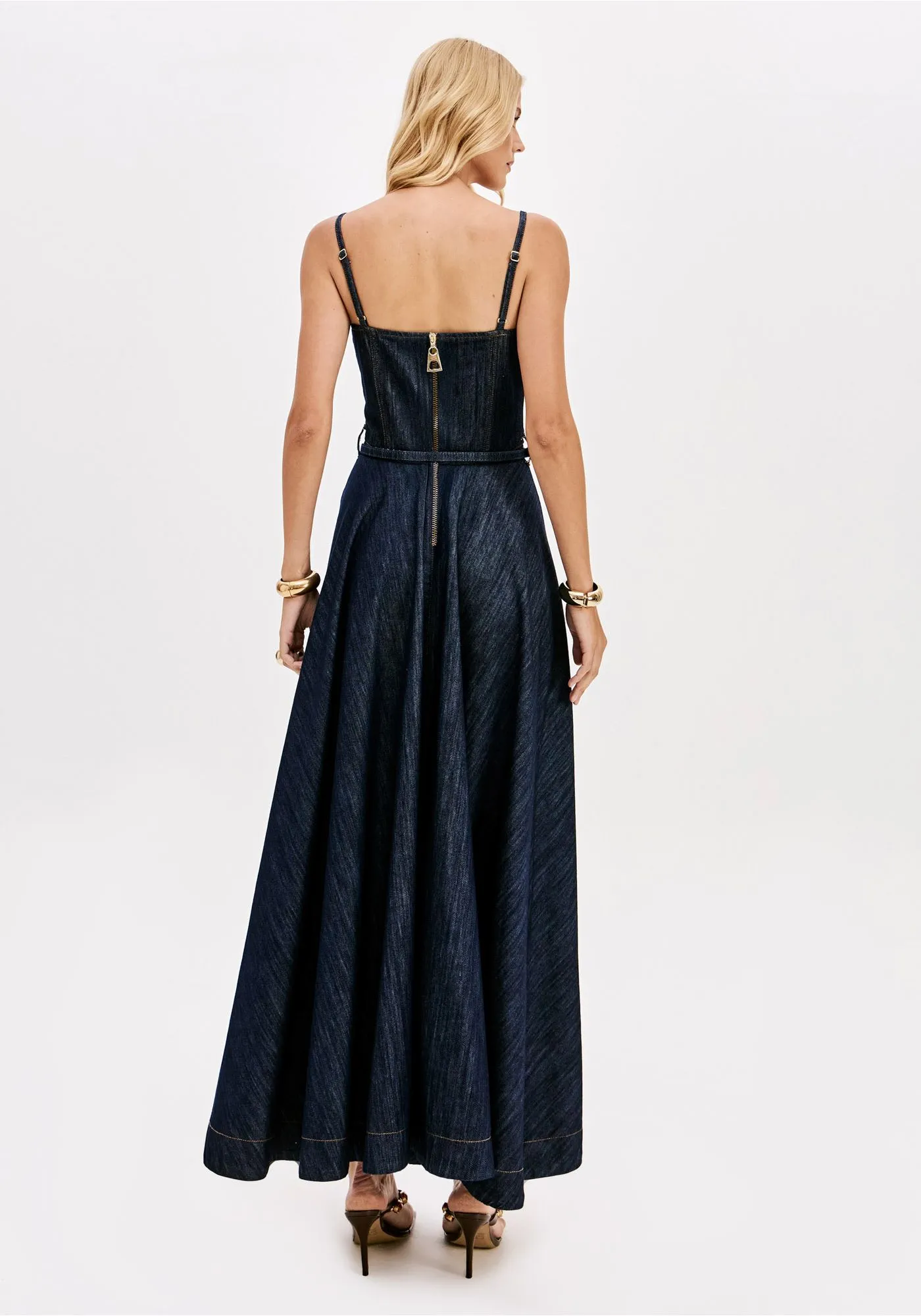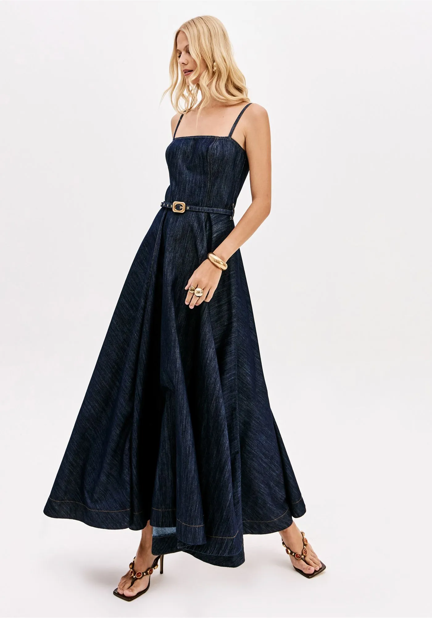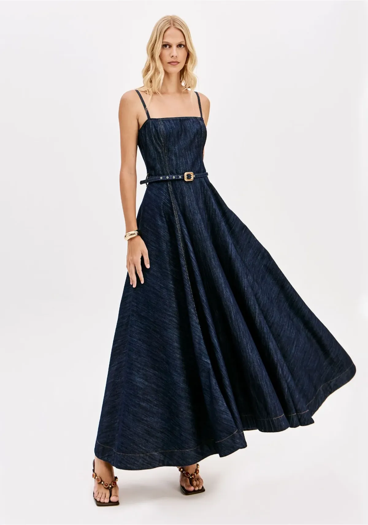 Feito em jeans sem elasticidade, o vestido super midi traz modelagem ladylike com busto justo e saia ampla. Possui alças finas com regulador, decote reto, fechamento por zíper e cinto delicado com fivela. Aposte nesta escolha e destaque suas produções!