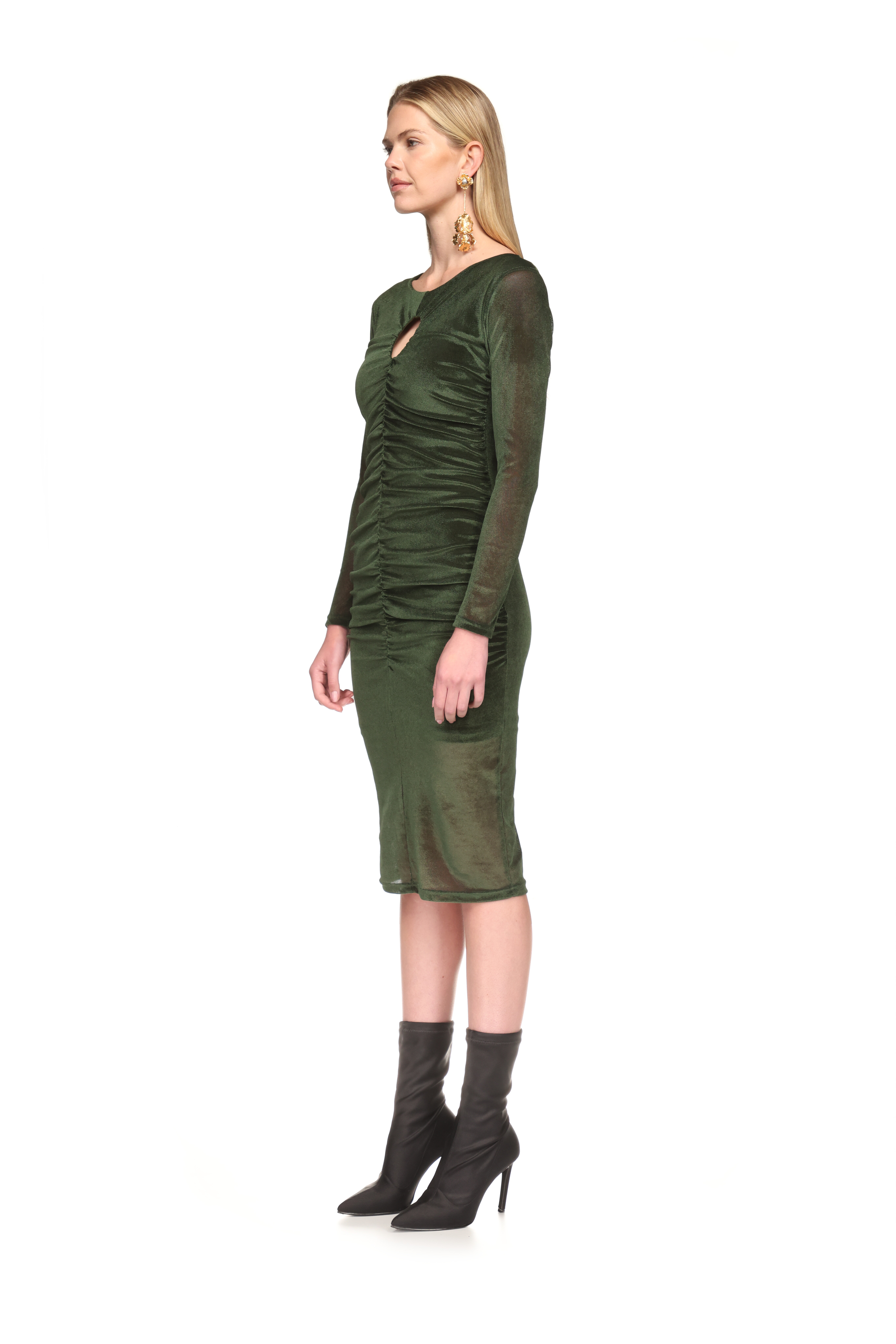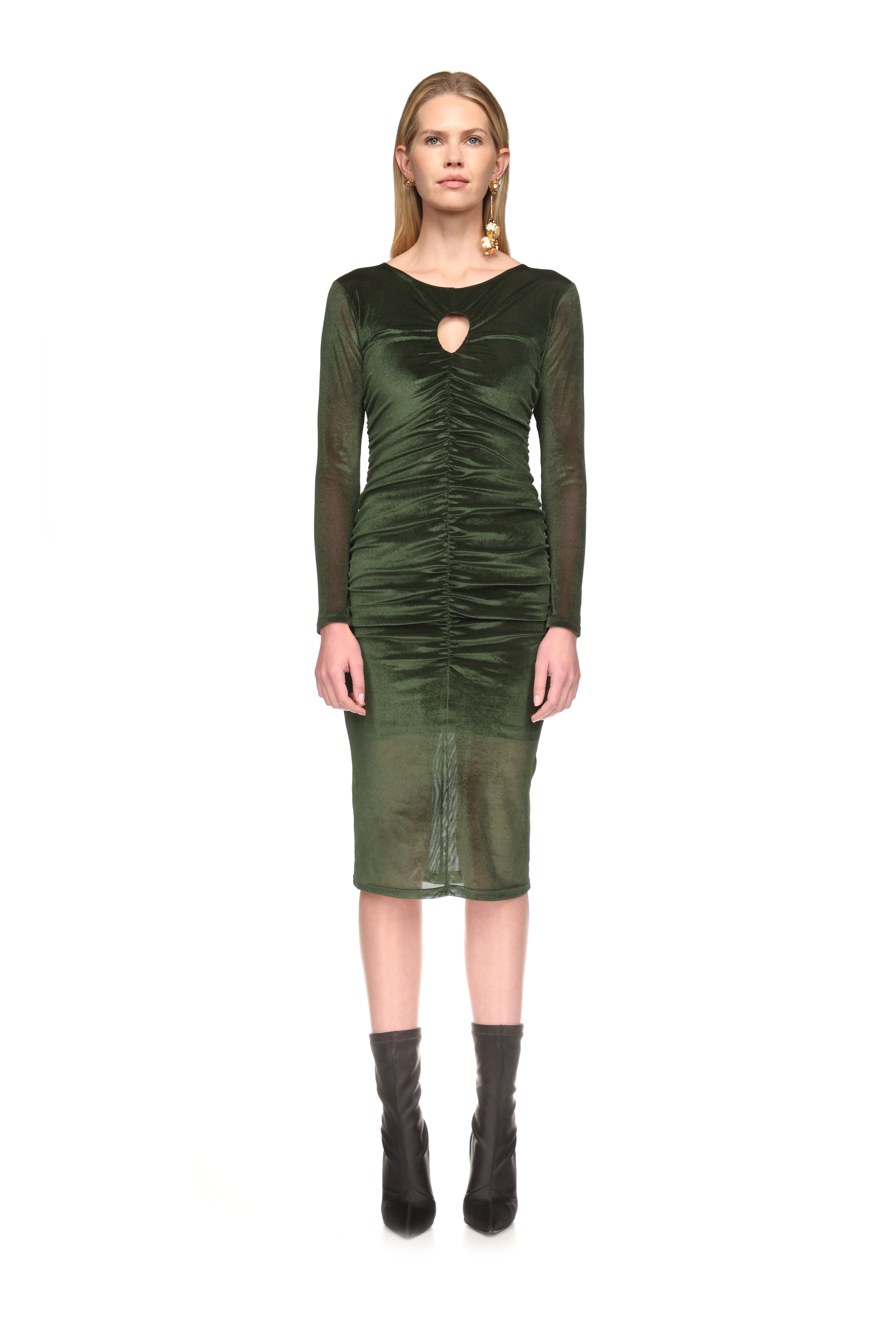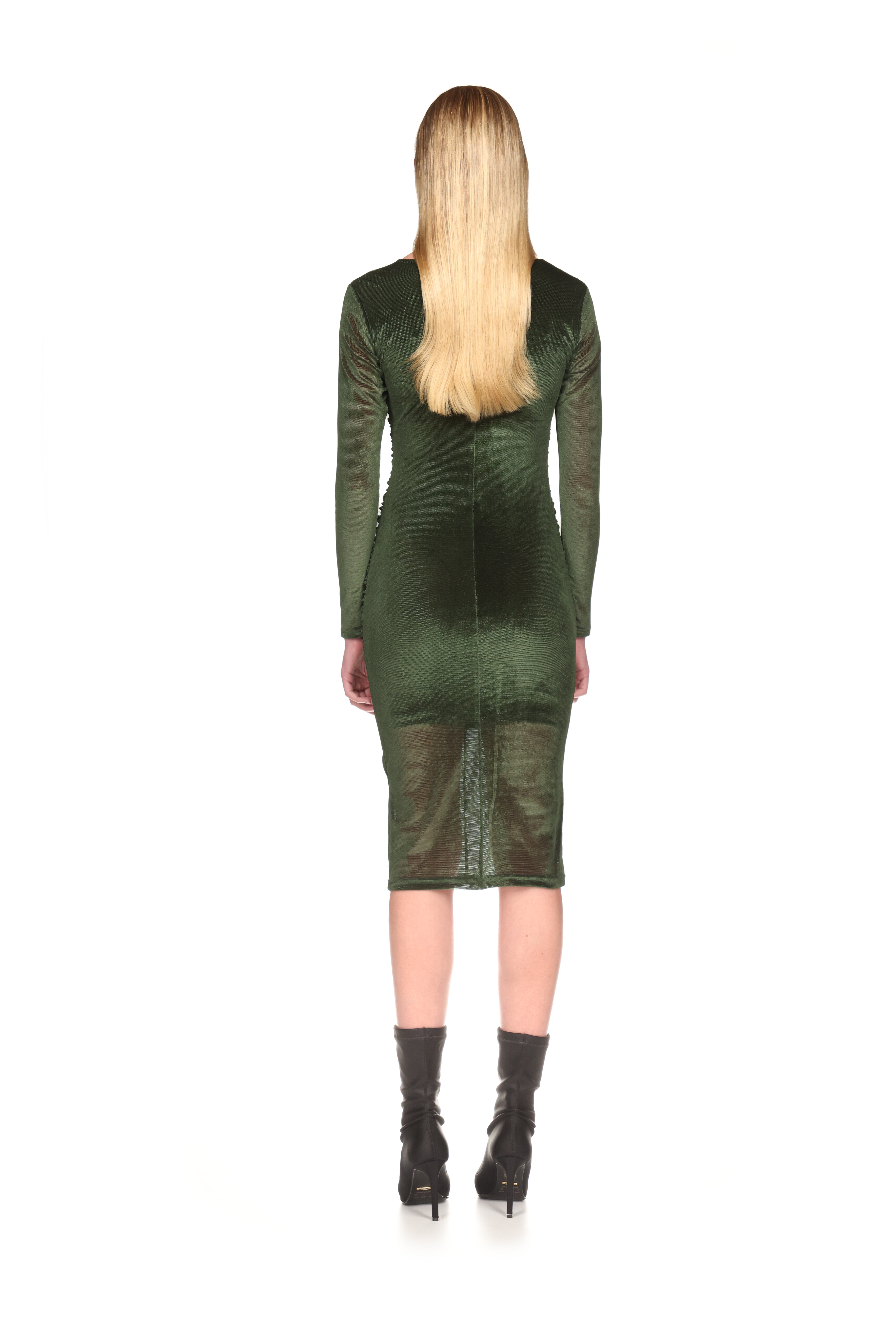 Vestido midi confecionado em tule aveludado. Decote redondo e manga comprida. Corte reto e justo. Forro no tom.