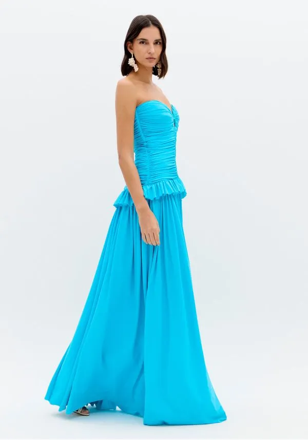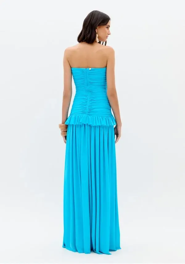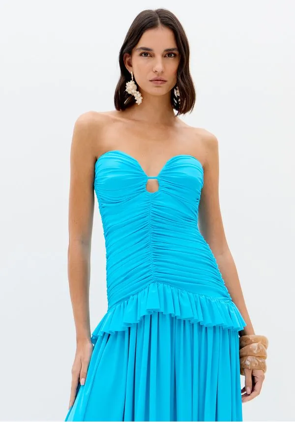 O vestido longo é feito em malha leve com modelagem franzida e caimento justo ao corpo. Possui busto estruturado com bojo, recorte no decote, zíper posterior e saia fluida. O babado pontual confere charme extra à versão. Escolha certa em dias especiais!