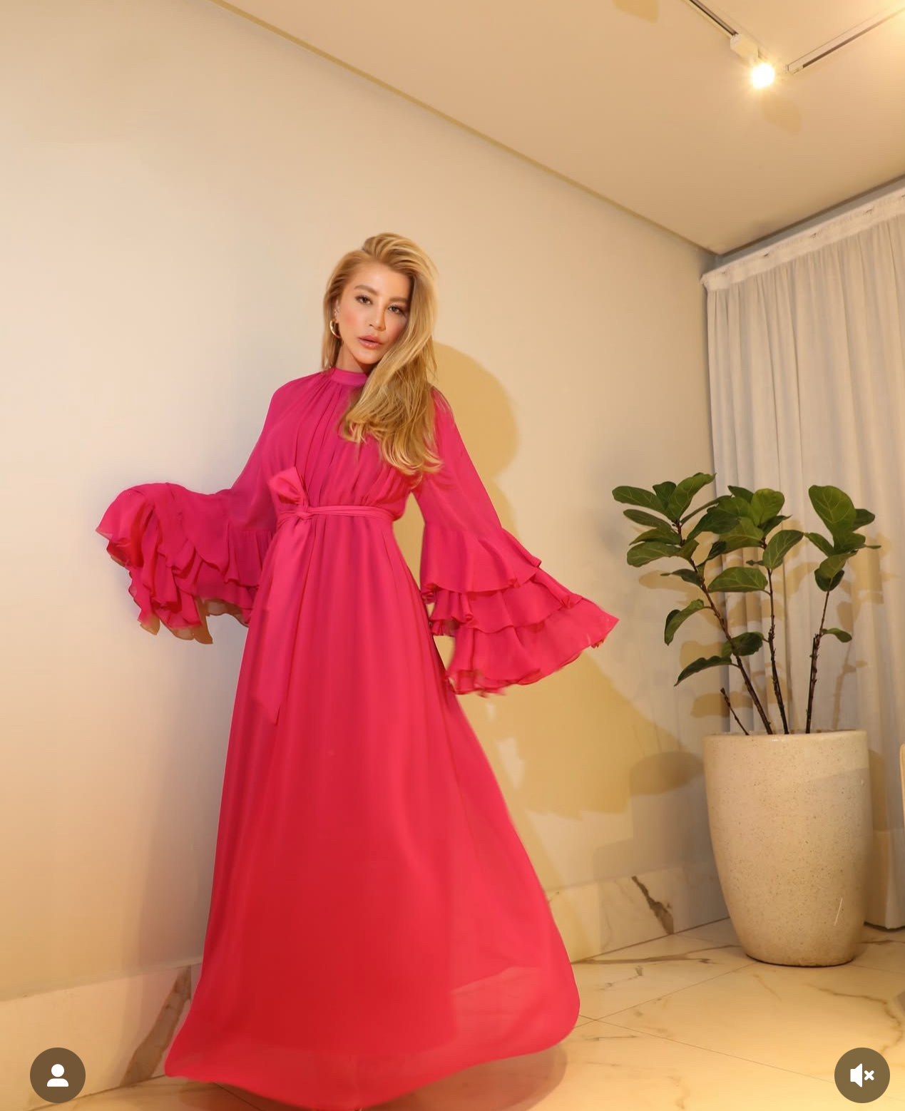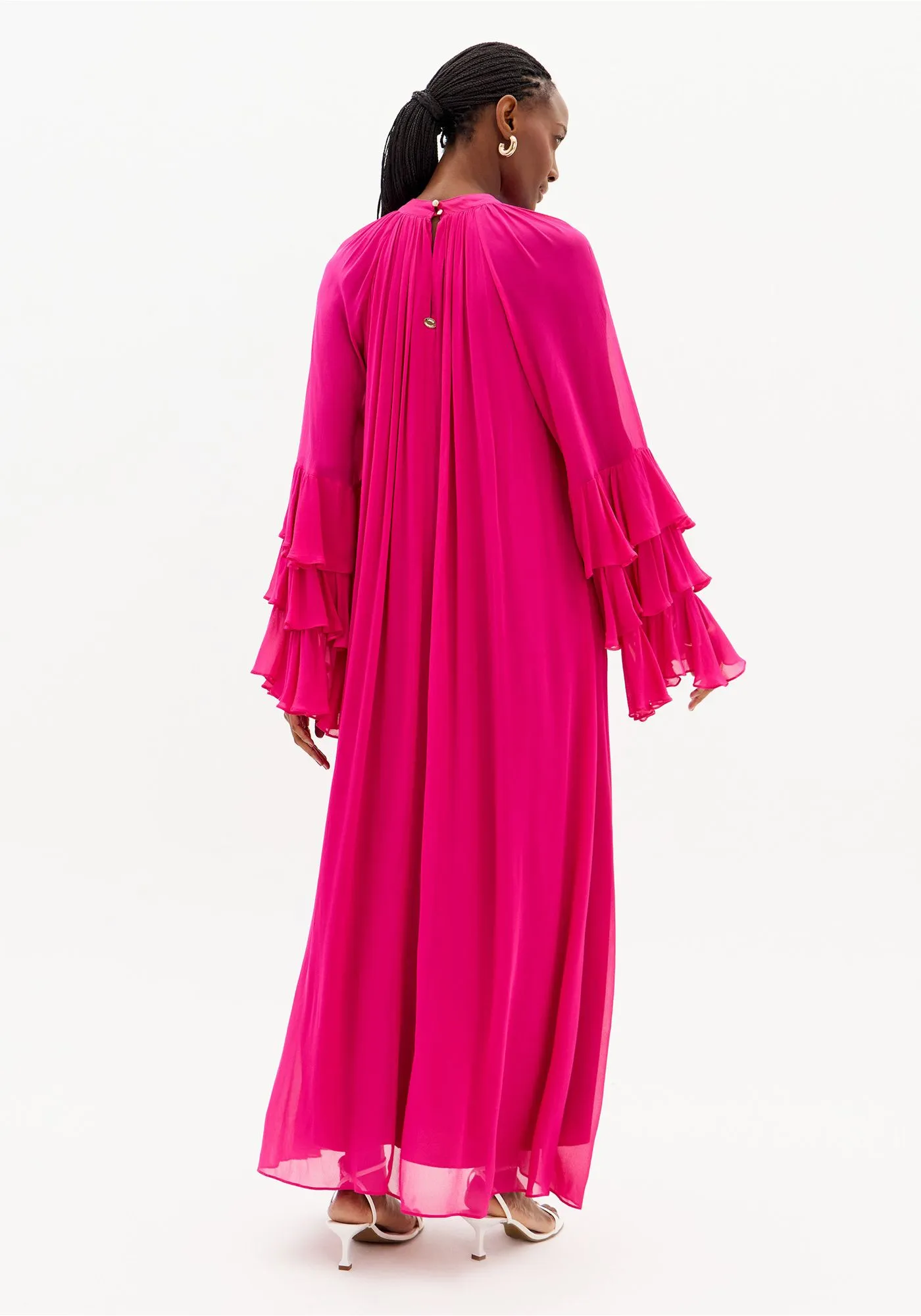 O vestido longo de chiffon é pura leveza e romantismo. A peça conta com mangas longas esvoaçantes e babados delicados. Seu caimento amplo proporciona movimento fluido e elegante, perfeito para ocasiões especiais ou para quem busca um look com feminino e marcante.