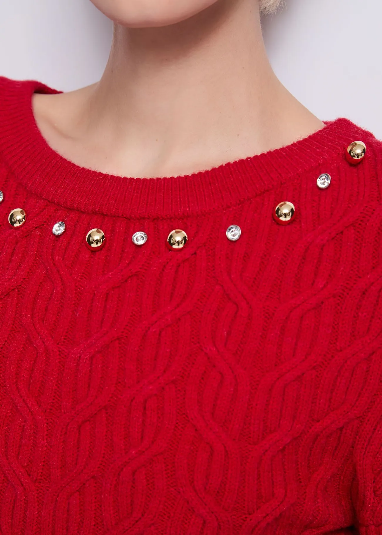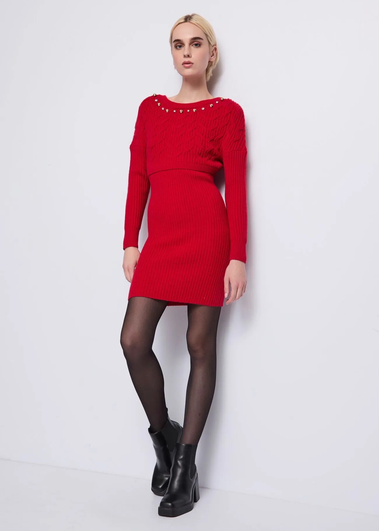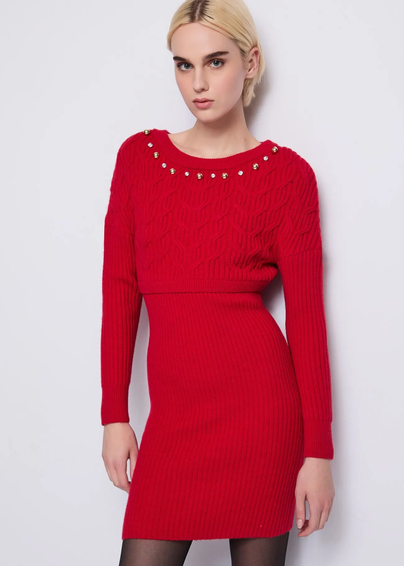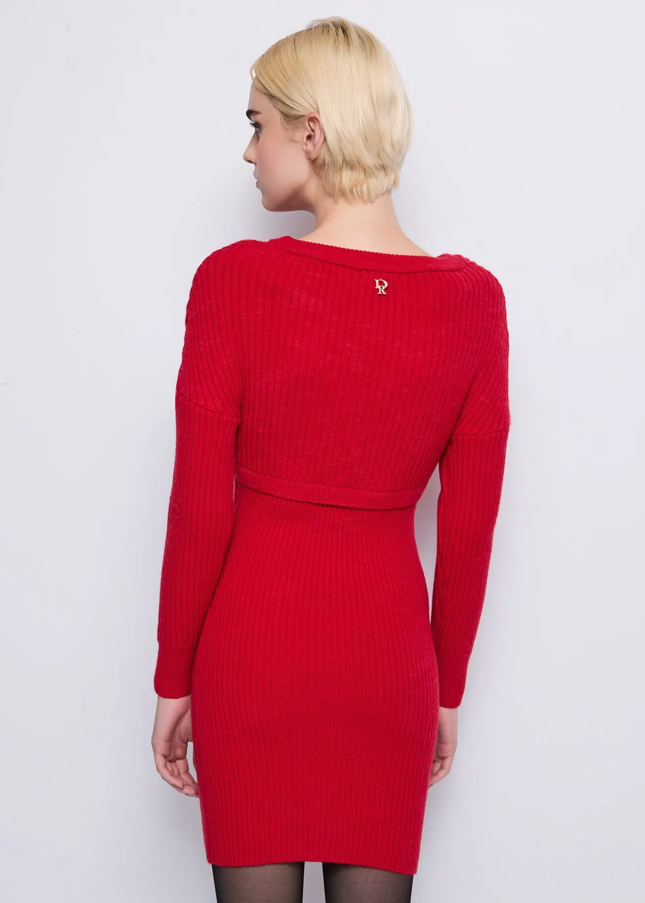 Vestido curto em malha de lã mista Canelado e malha entrançada Aplicações de strass e mini tachas Gola redonda Mangas compridas Logótipo DR em metal nas costas