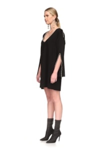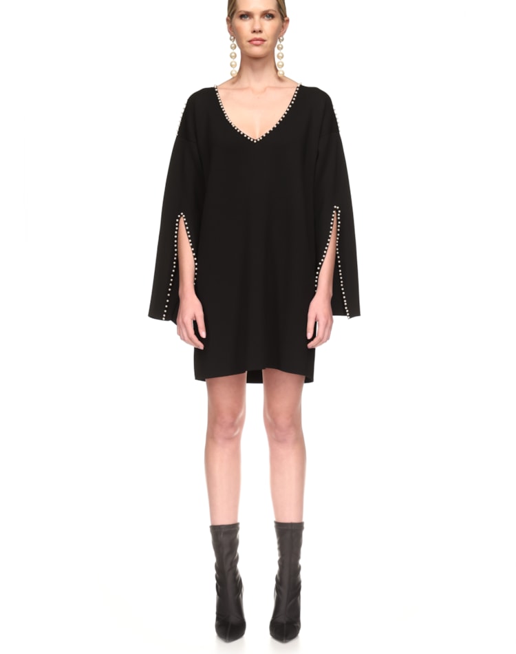 Vestido de malha suave. Manga comprida e decote em bico. Detalhes em pérolas cuidadosamente aplicados na parte da frente e mangas.Corte direito e comprimento médio.