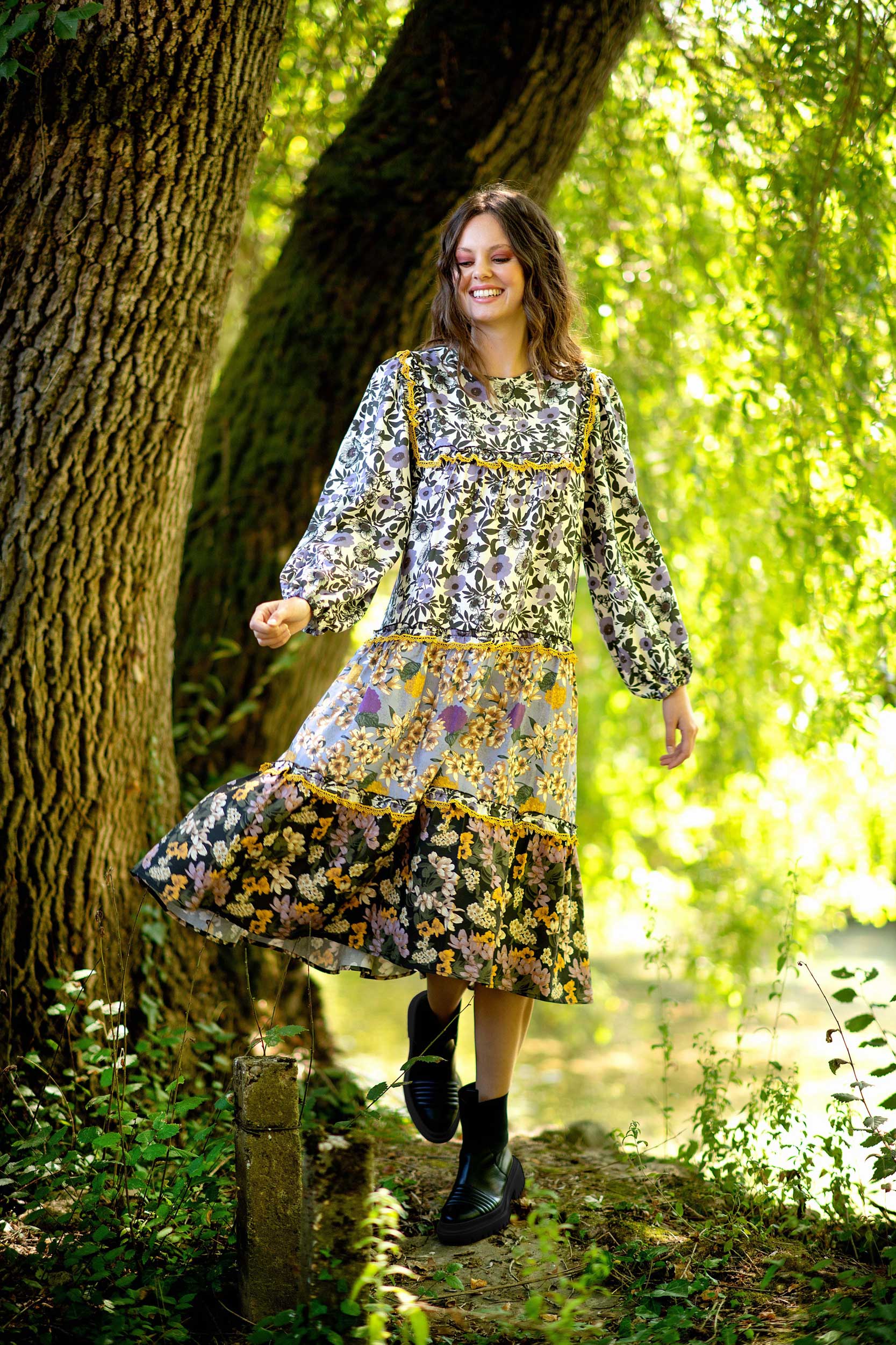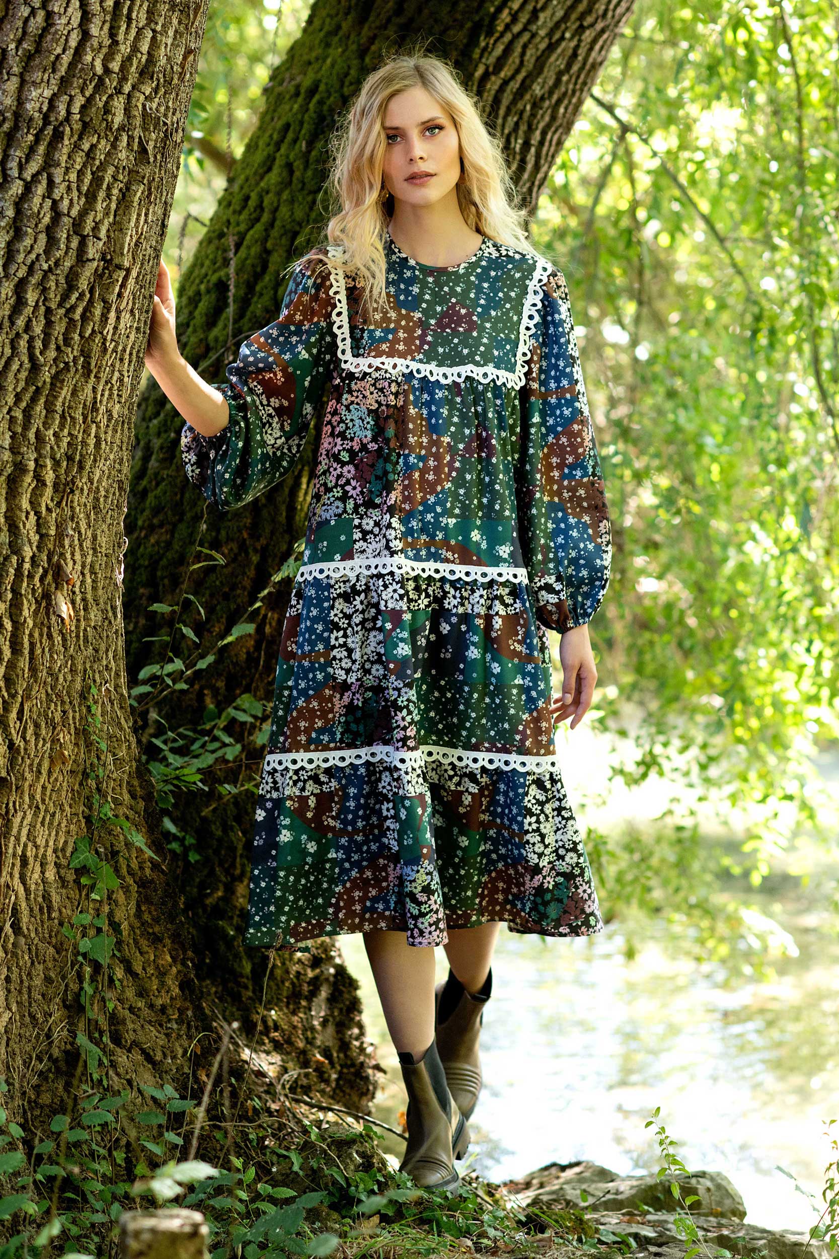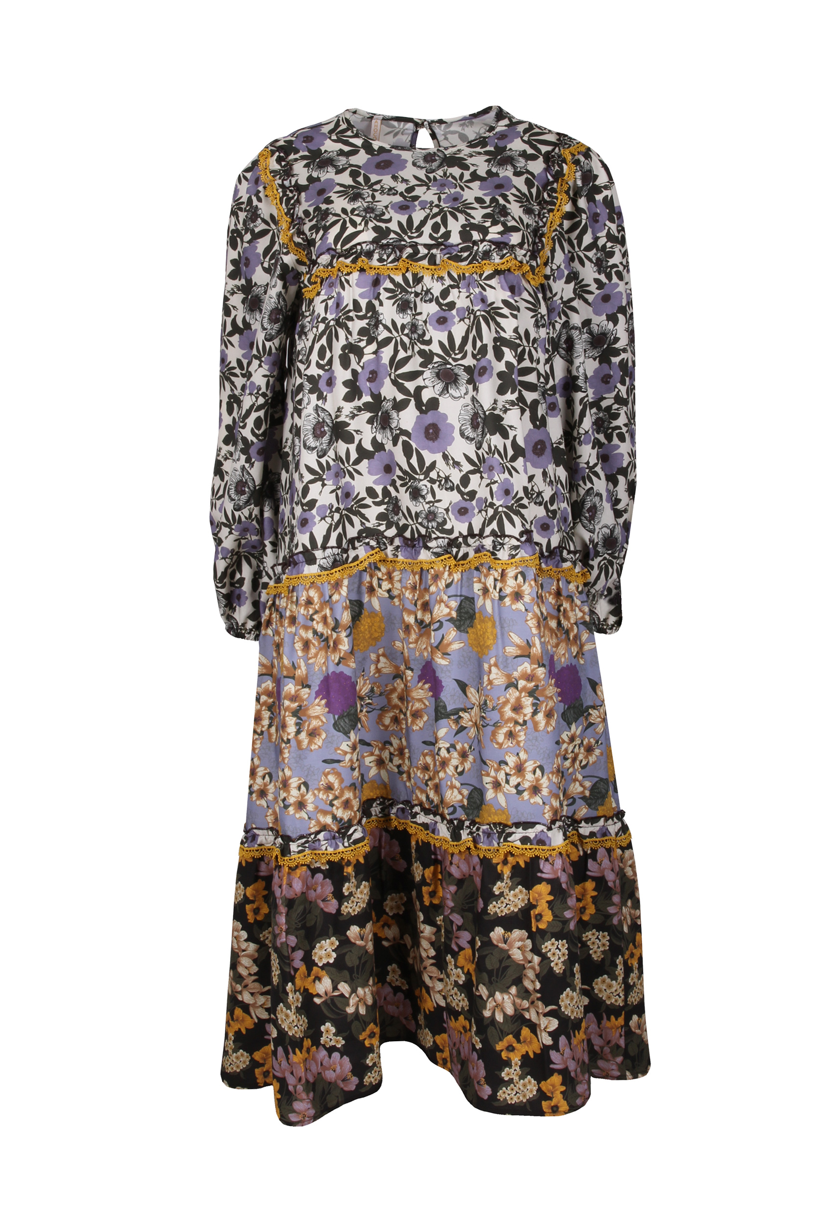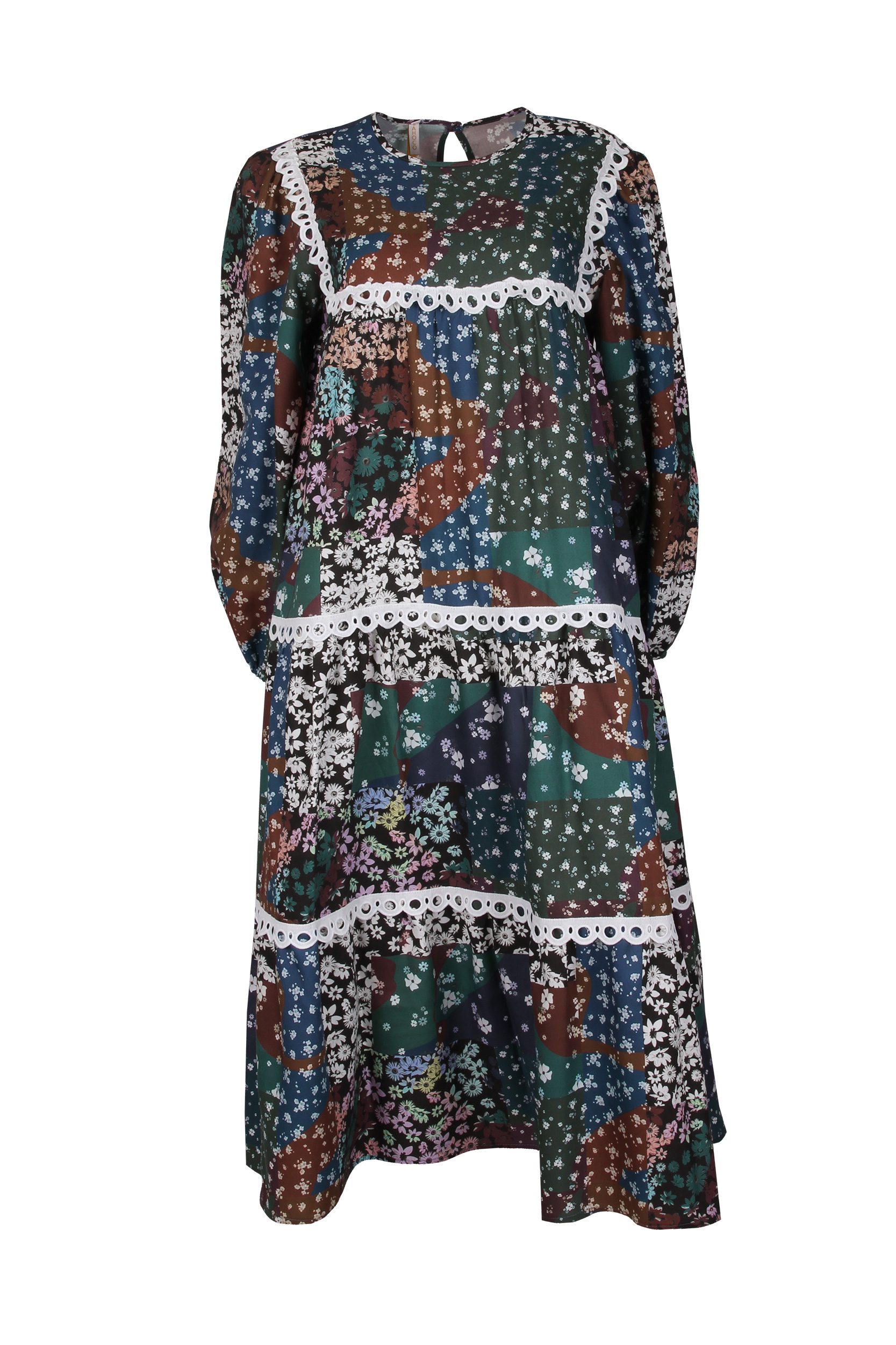 Vestido comprido padrão flores, e com aplicações de renda a marcar parte do peito e parte inferior