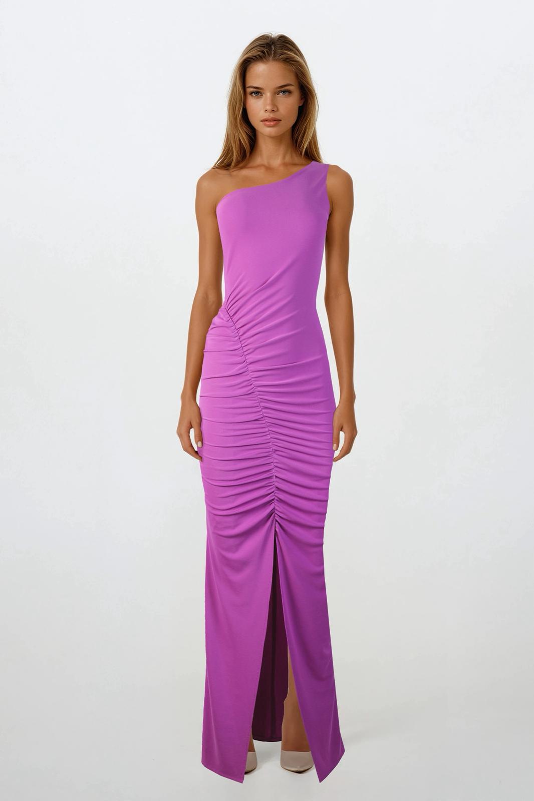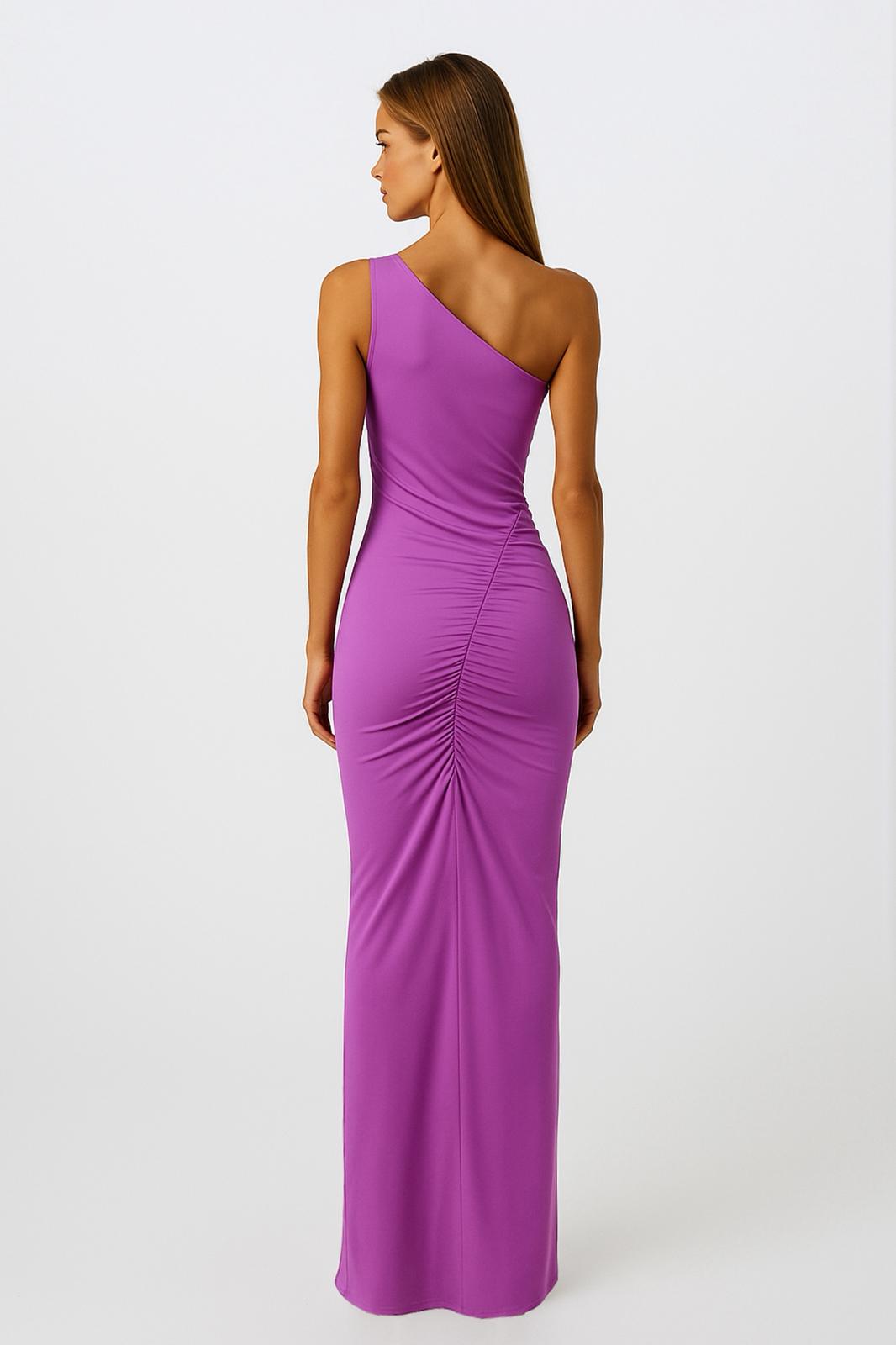 Este vestido de corte assimétrico, com drapeado estratégico e uma elegante racha frontal, destaca-se pelo seu movimento fluido e silhueta escultural.