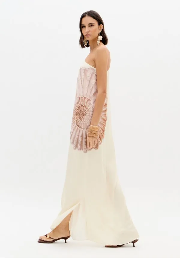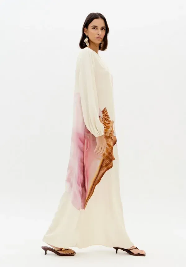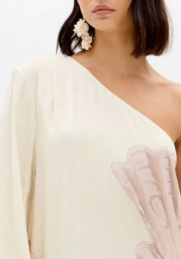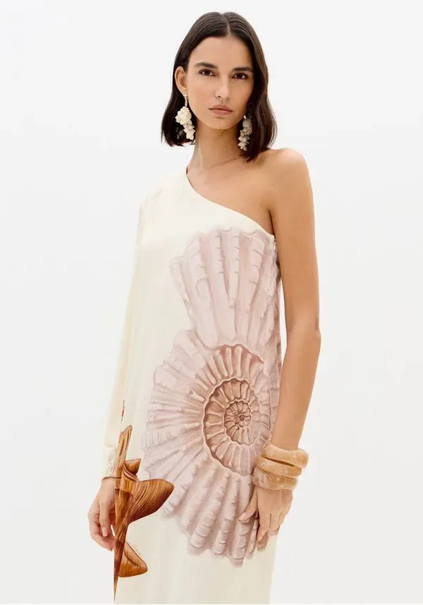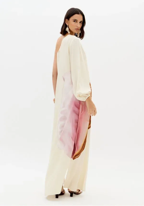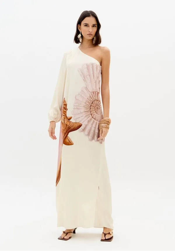 O vestido super midi estampado é feito em tecido leve e fluido. Apresenta modelagem de um ombro só com manga longa, punho ajustado e caimento solto, além de fenda lateral que garante movimento. O fechamento por zíper acrescenta praticidade ao modelo.