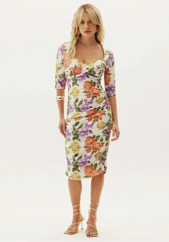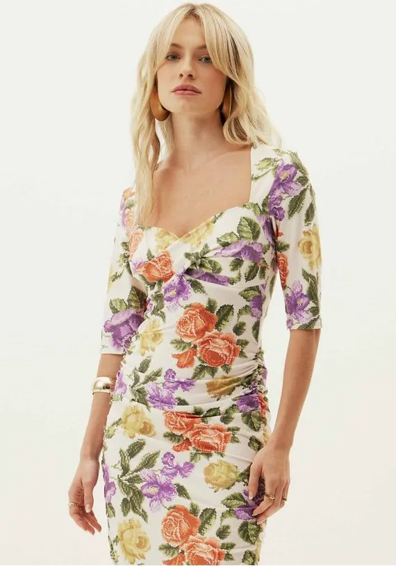 O vestido curto apresenta estampa e drapeado, garantindo um look fashion! aposte!