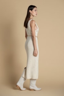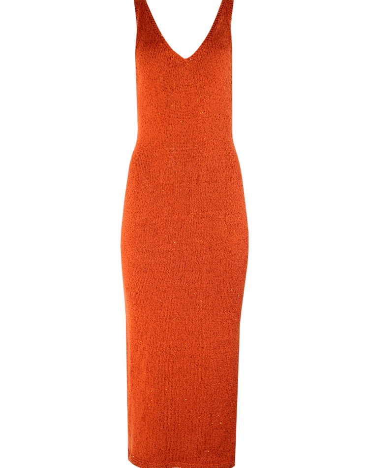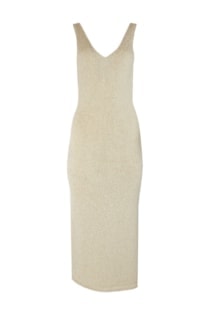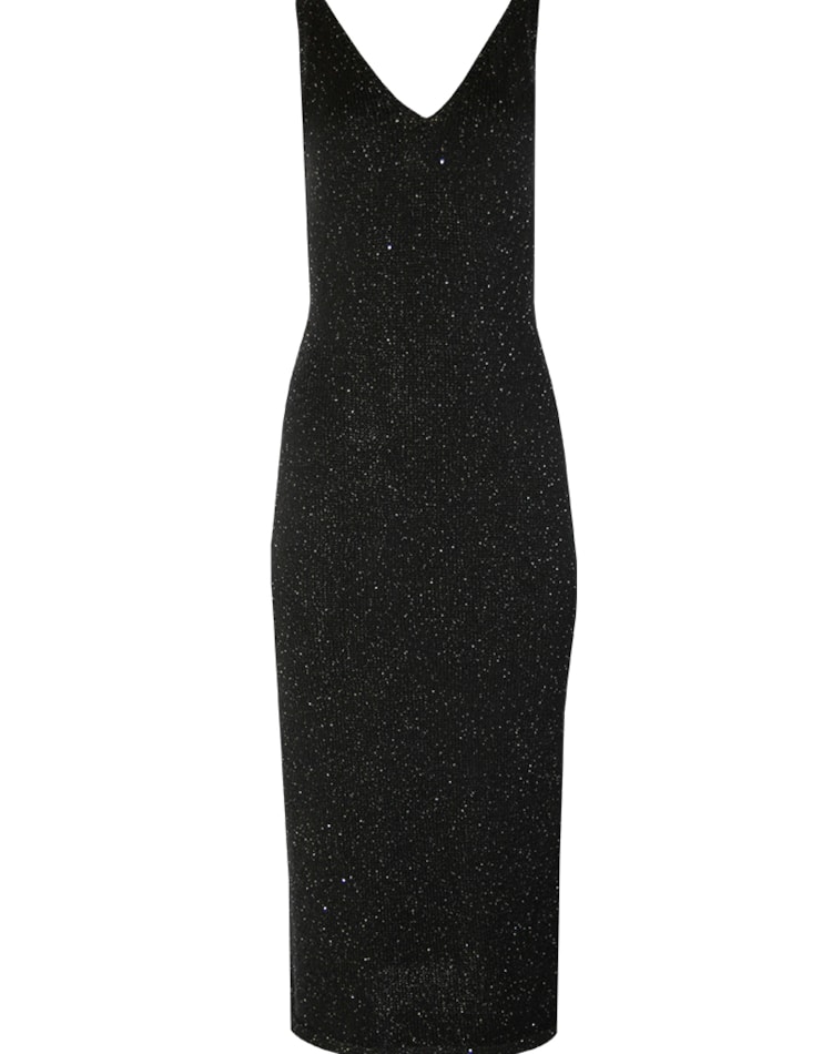 Vestido midi de malha com lantejoulas. Decote em bico.