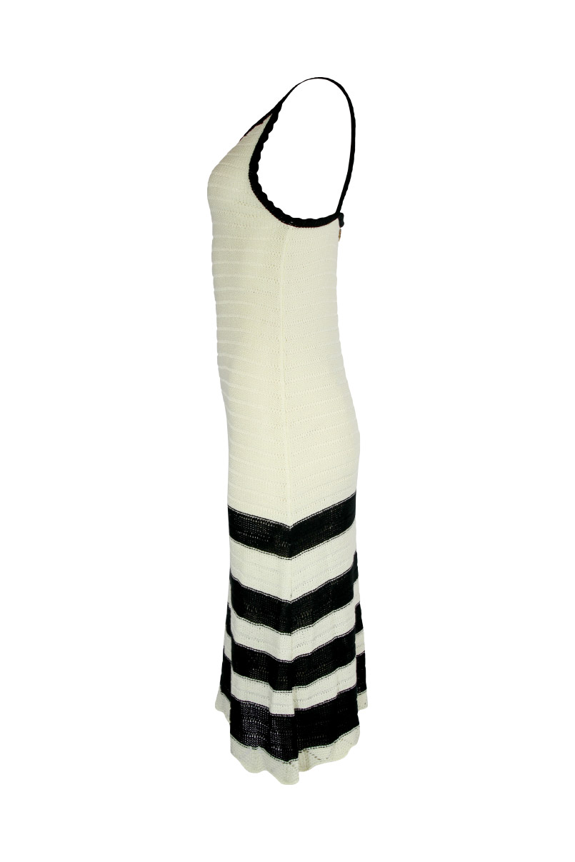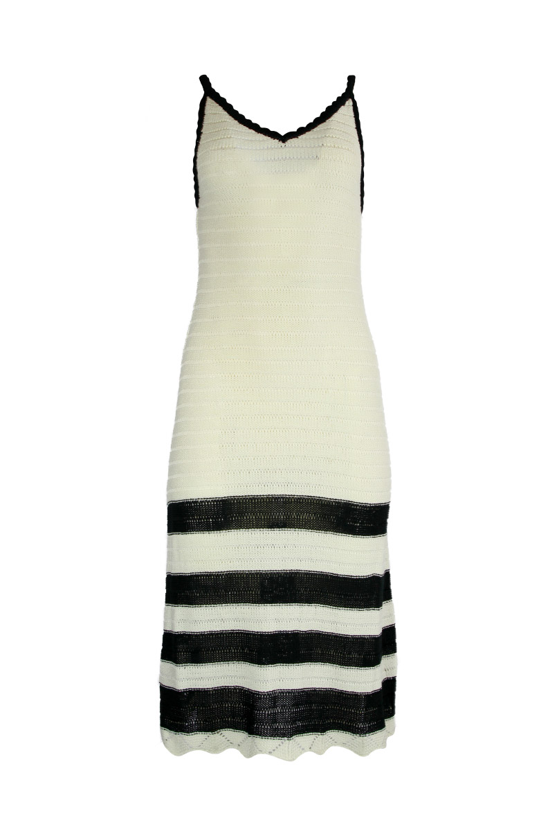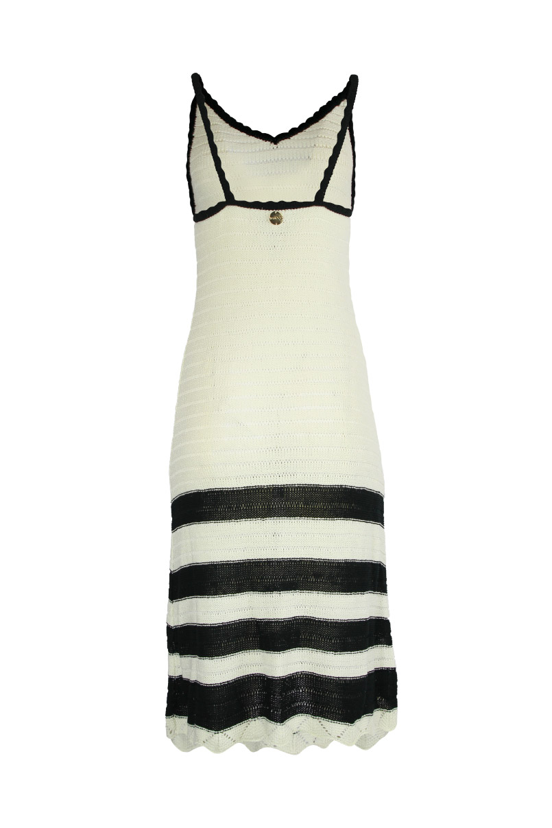 Vestido em malha tricotada, decote em bico e alças finas.