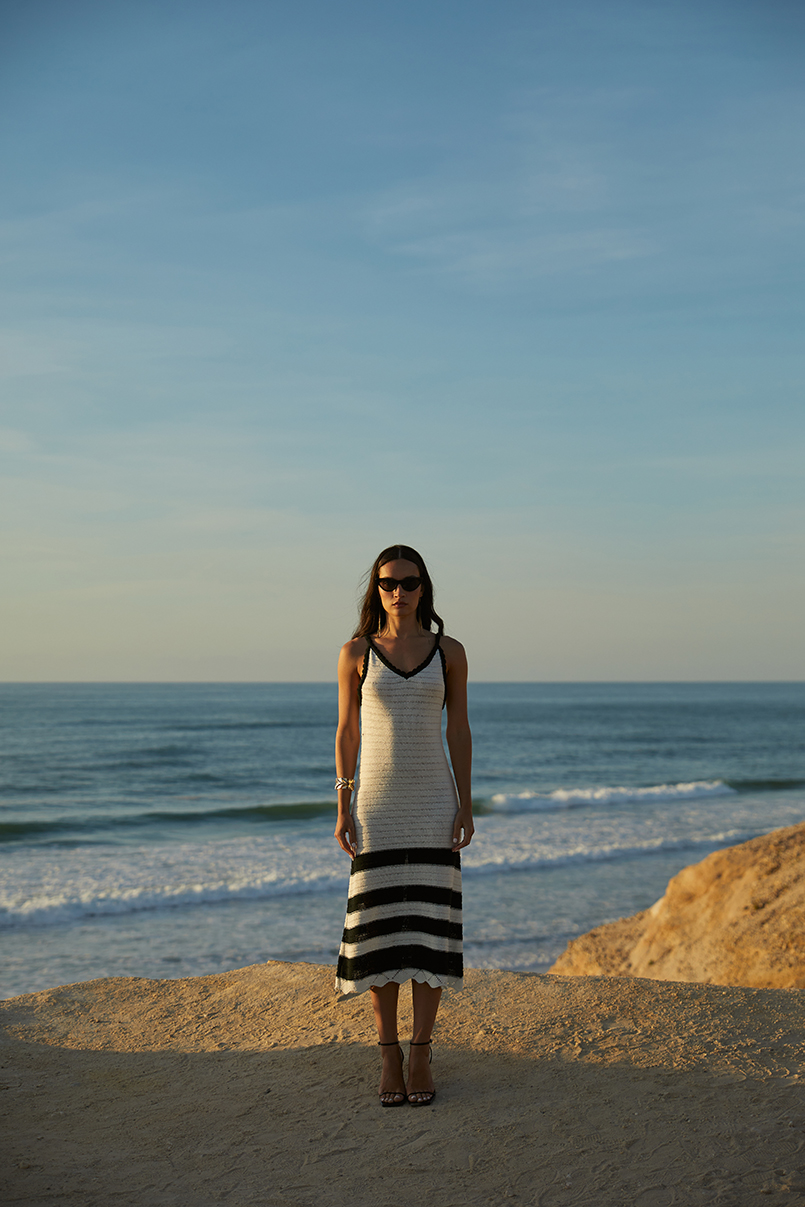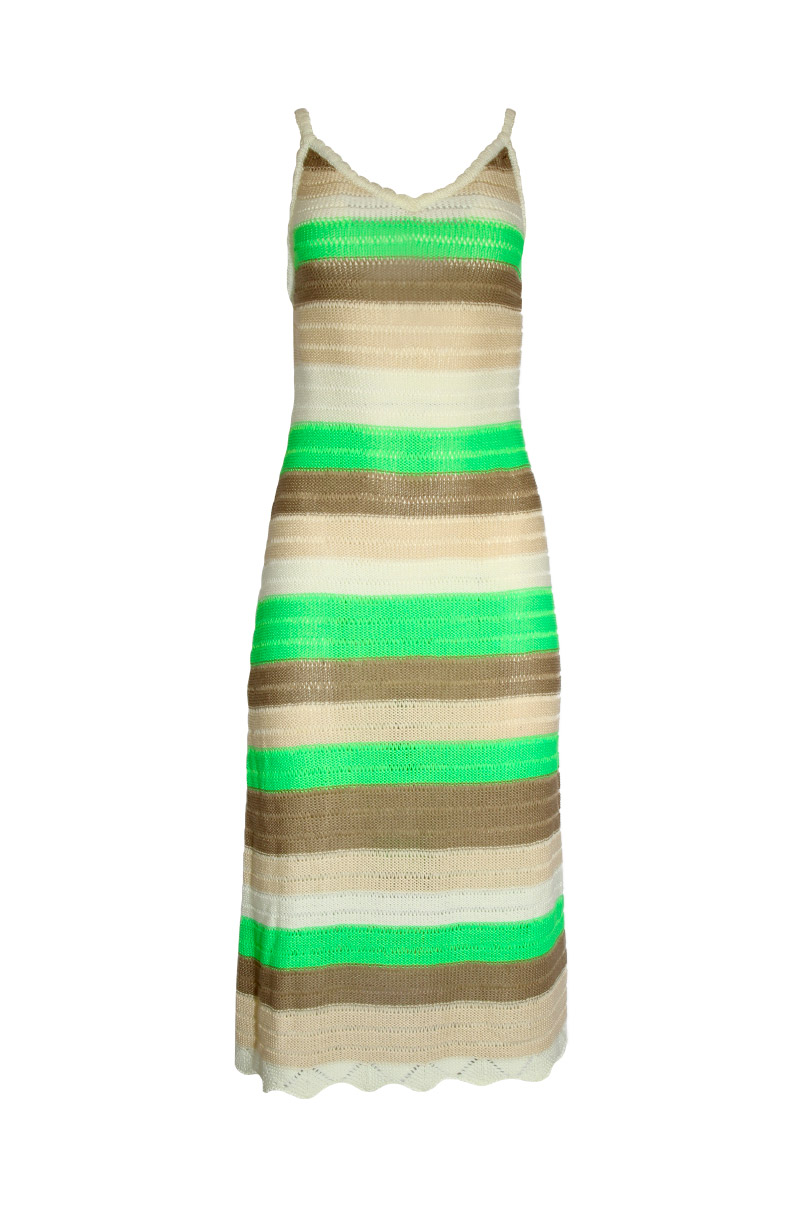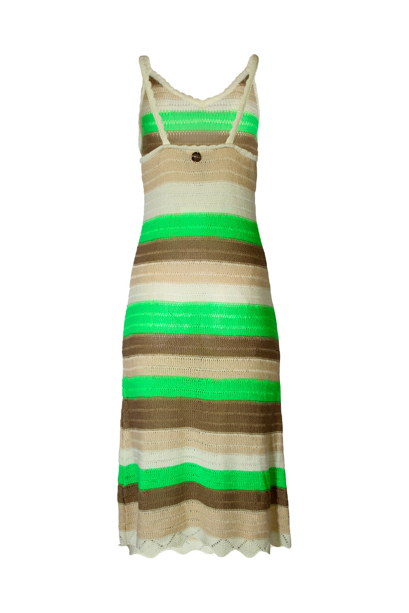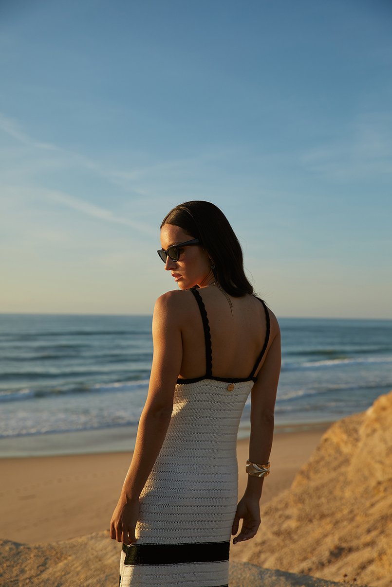 Vestido em malha tricotada, decote em bico e alças finas.