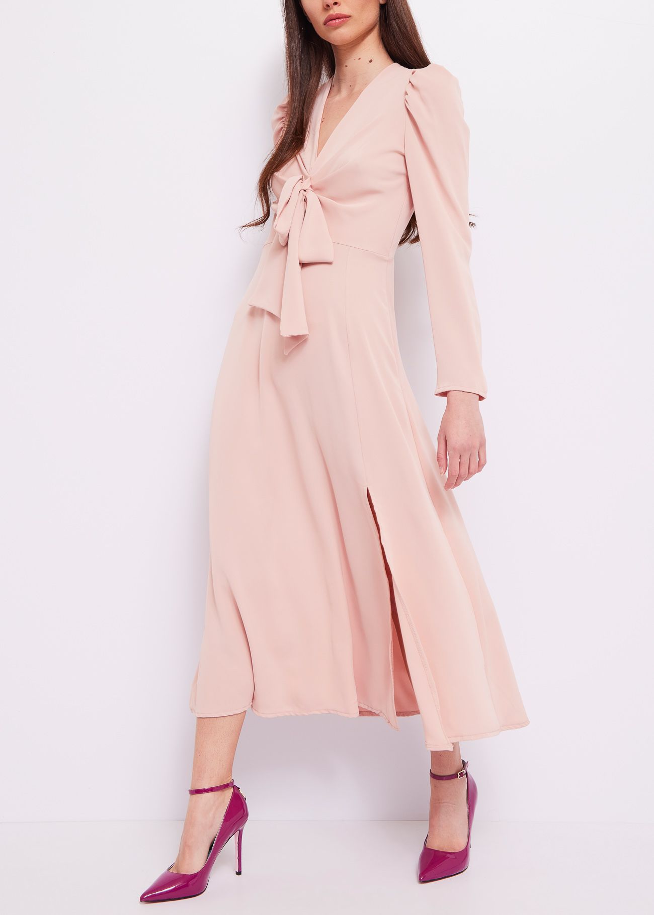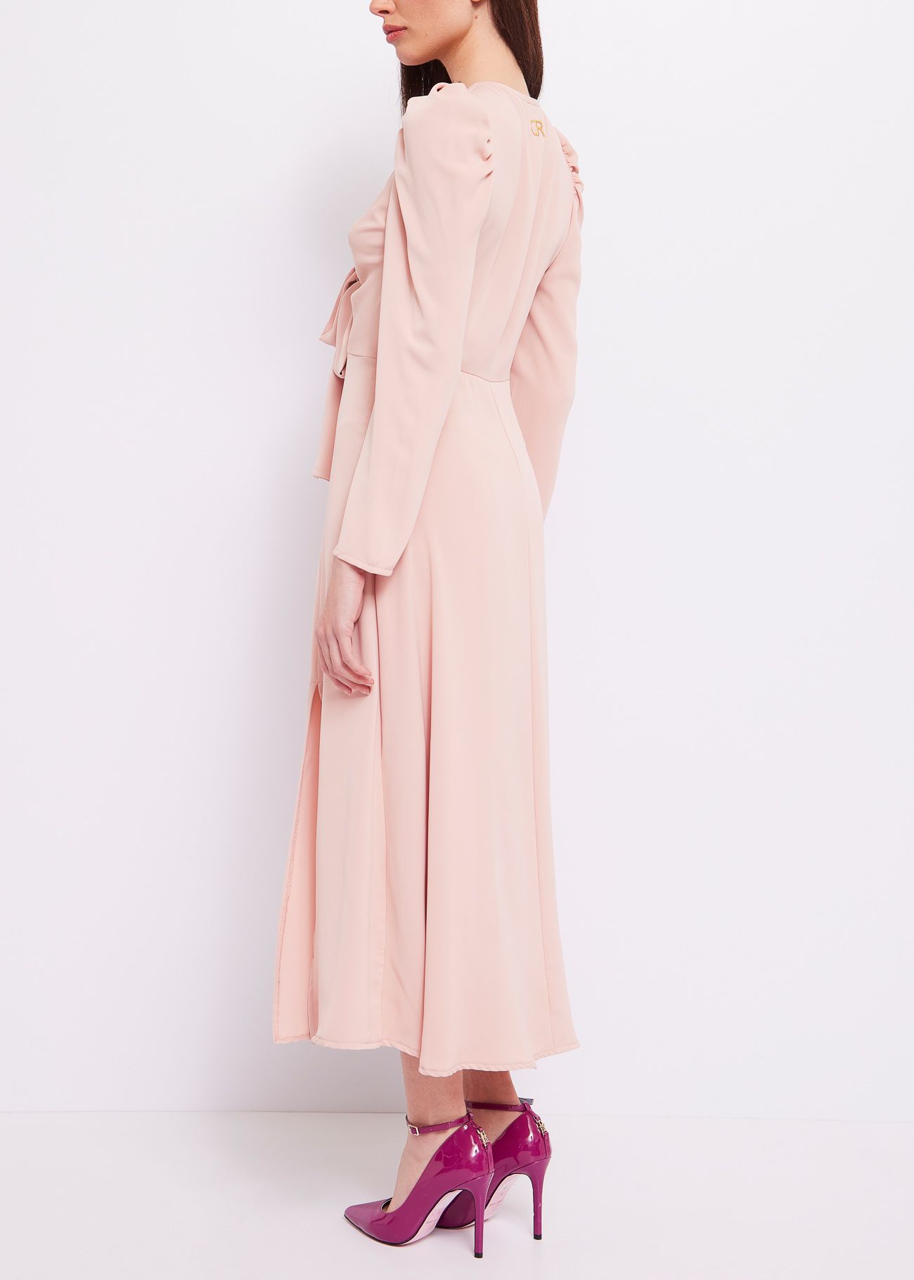 Vestido comprido com decote e pormenor do folho no decote