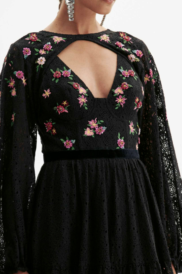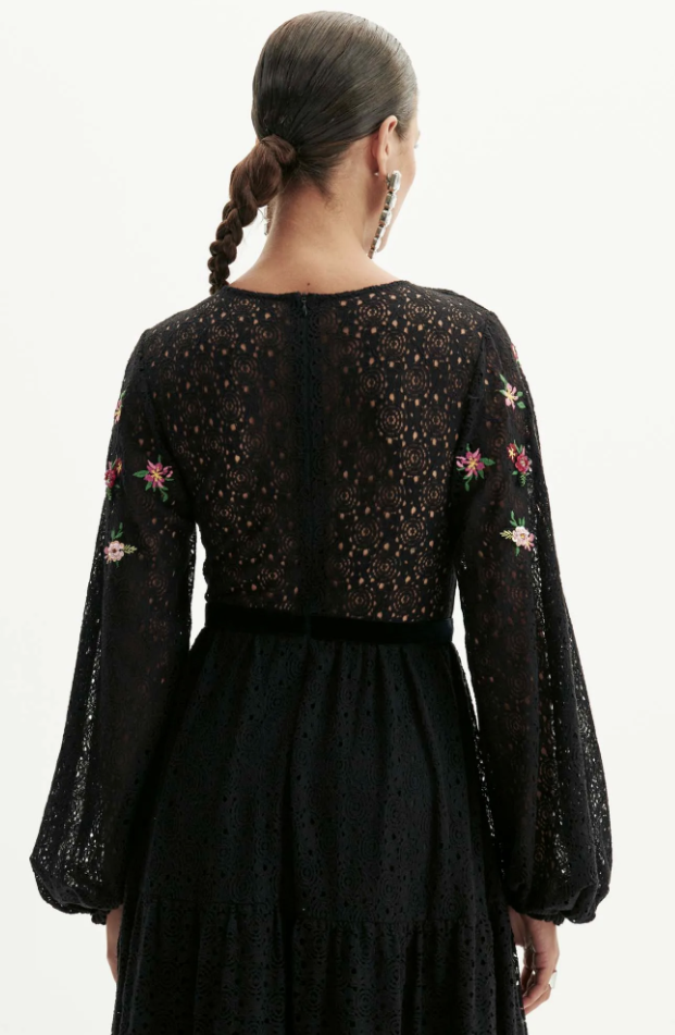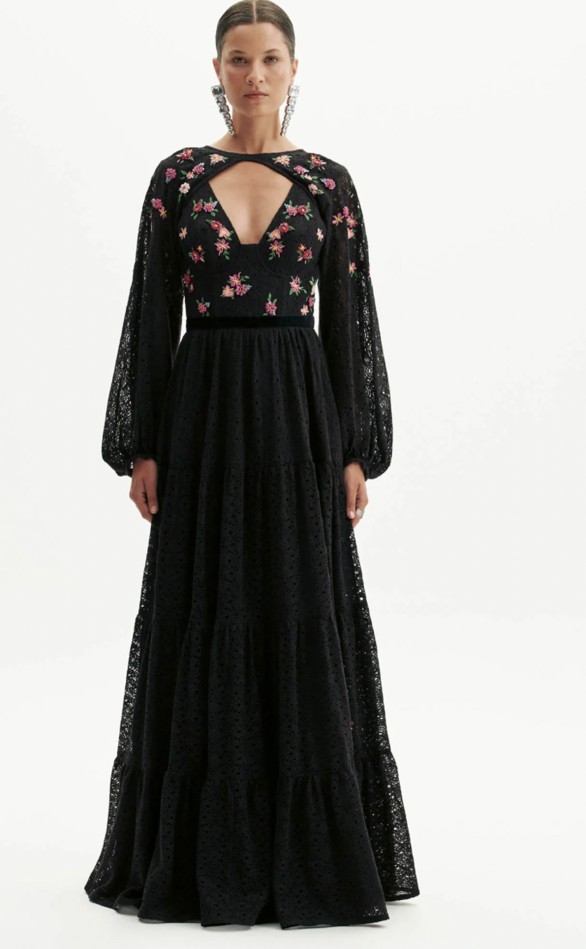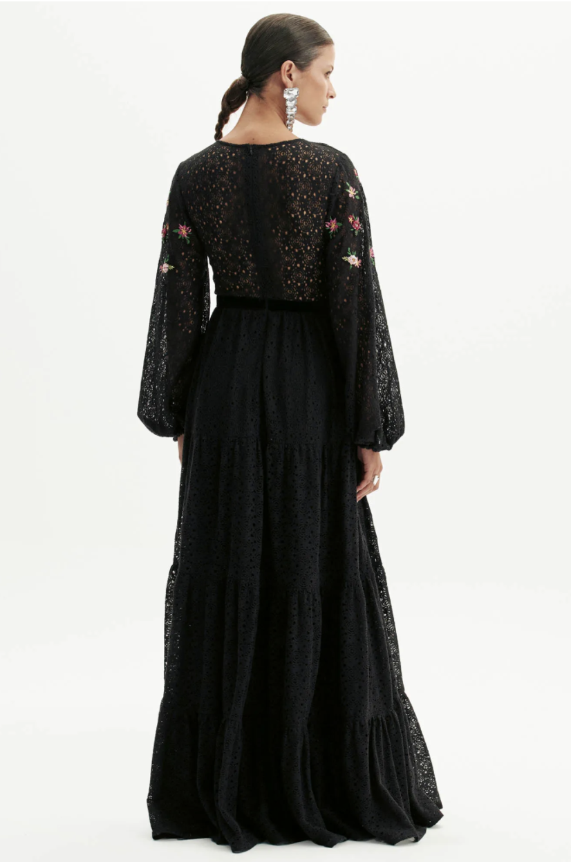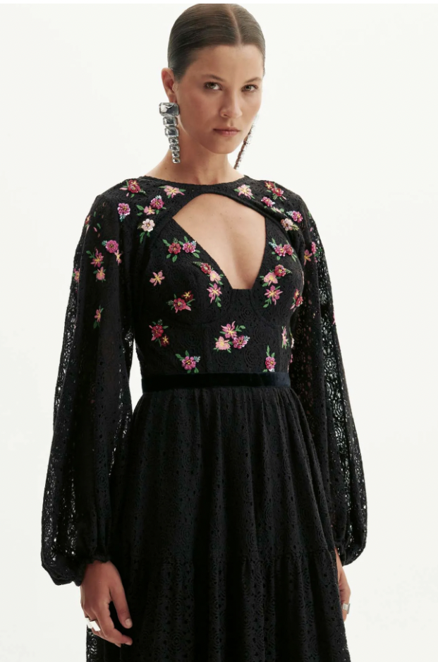 vestido longo possui mangas amplas, bojo estruturado e fechamento por zíper. Delicados bordados florais reforçam a elegância da modelagem fluida e romântica, revelando o equilíbrio perfeito entre charme e sofisticação. Para momentos especiais!
