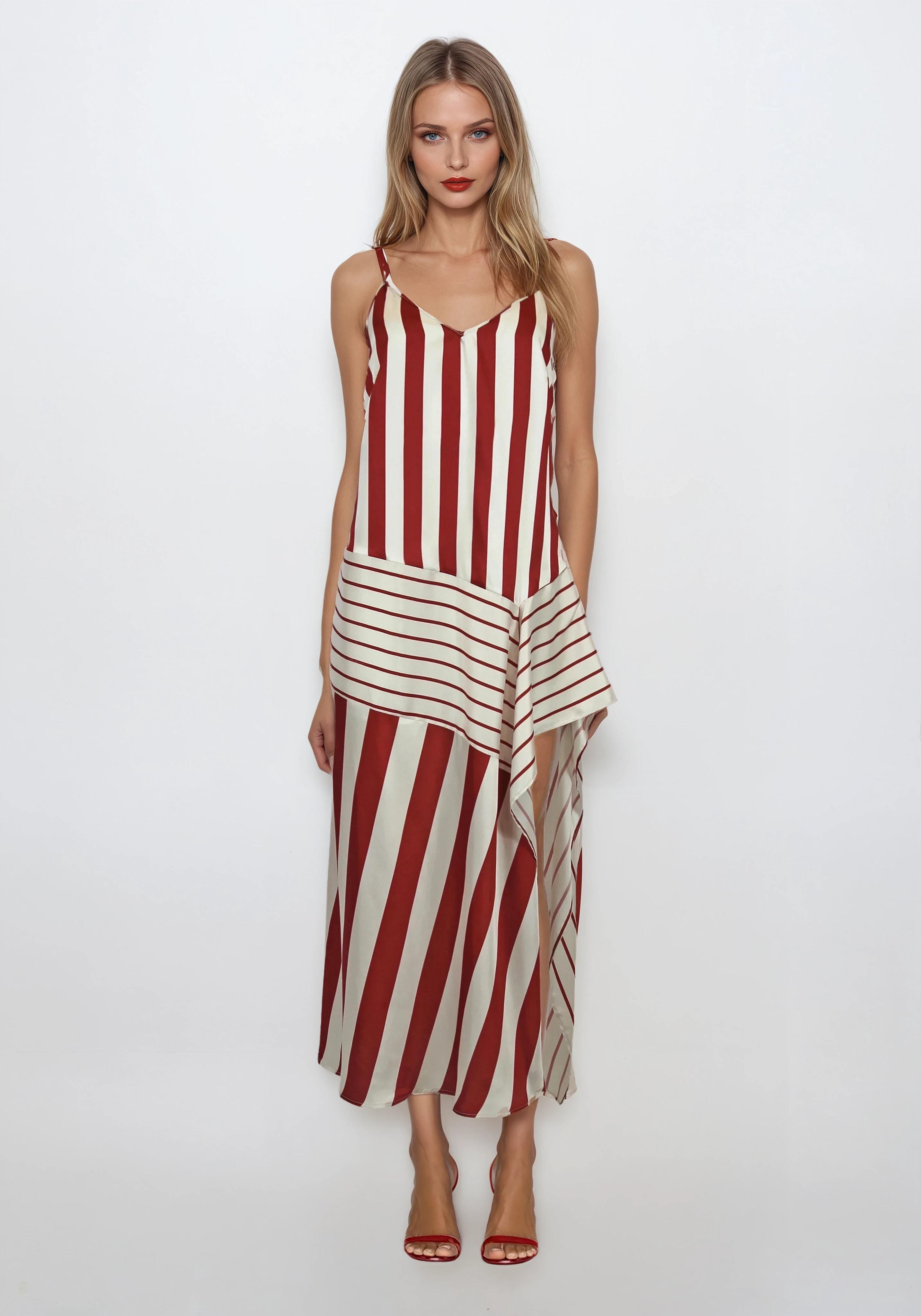 Vestido midi em tecido fluido com estampa tropical. Decote em bico e alças finas,