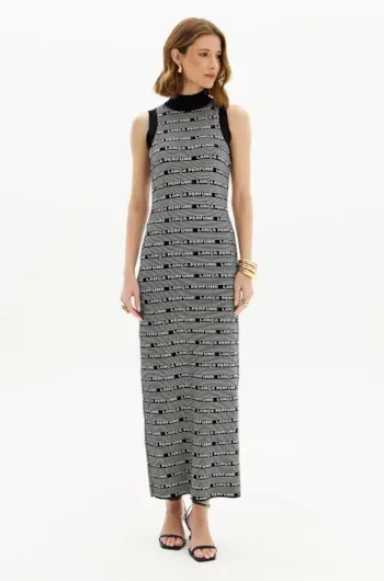 O vestido super midi em tricot possui caimento justo que valoriza a silhueta. A gola alta adiciona sofisticação, enquanto as listras trazem um toque dinâmico ao design. A fenda lateral garante movimento e personalidade, é a escolha perfeita para um look marcante e estiloso