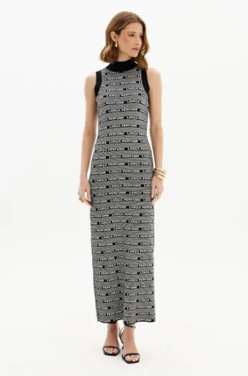 O vestido super midi em tricot possui caimento justo que valoriza a silhueta. A gola alta adiciona sofisticação, enquanto as listras trazem um toque dinâmico ao design. A fenda lateral garante movimento e personalidade, é a escolha perfeita para um look marcante e estiloso