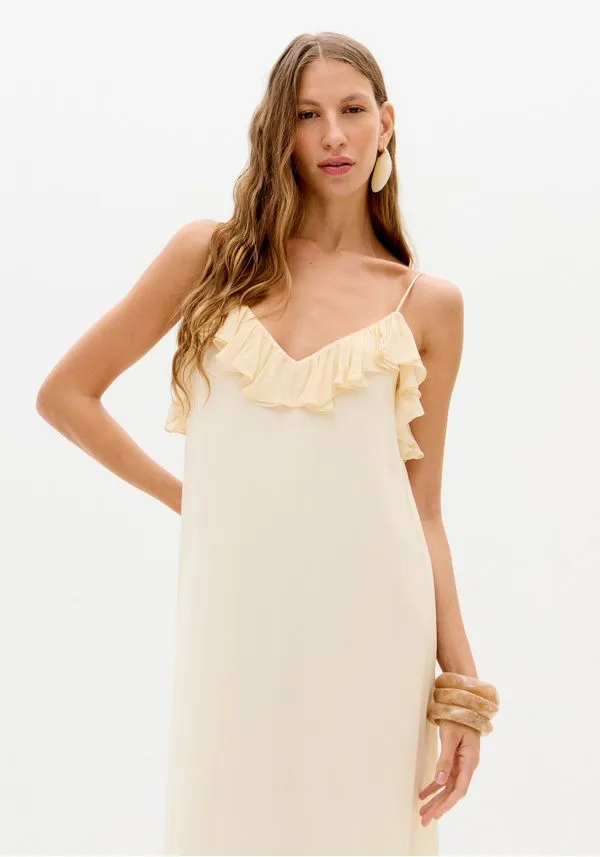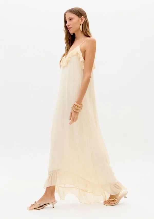 O vestido super midi é feito em chiffon, um tecido leve e fluido com transparência sutil. Possui alças reguláveis, decote em v e caimento solto no corpo. Os babados delicados aplicados pontualmente se destacam, trazendo movimento e feminilidade à peça.