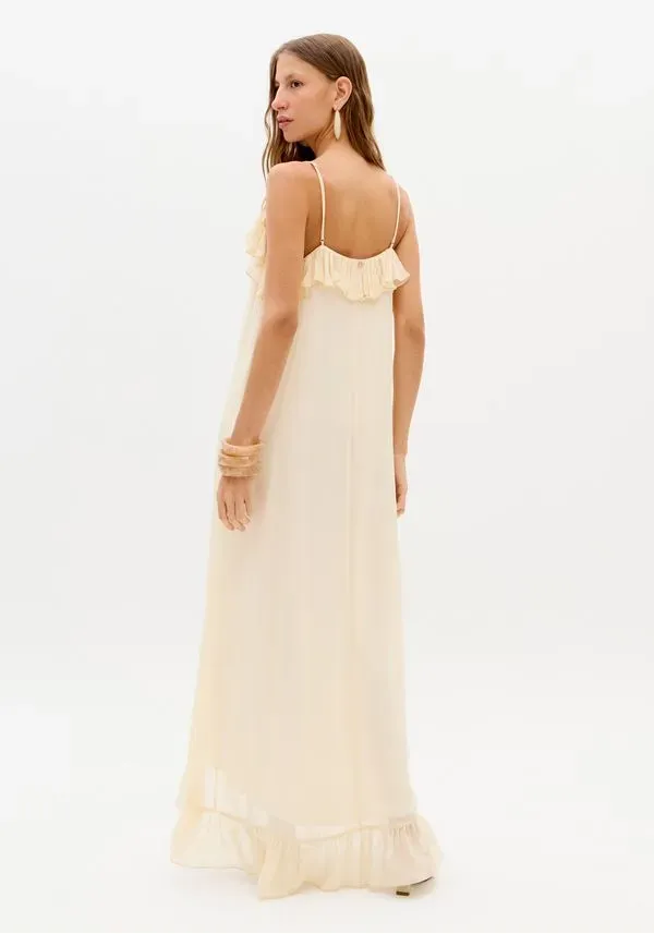 O vestido super midi é feito em chiffon, um tecido leve e fluido com transparência sutil. Possui alças reguláveis, decote em v e caimento solto no corpo. Os babados delicados aplicados pontualmente se destacam, trazendo movimento e feminilidade à peça.