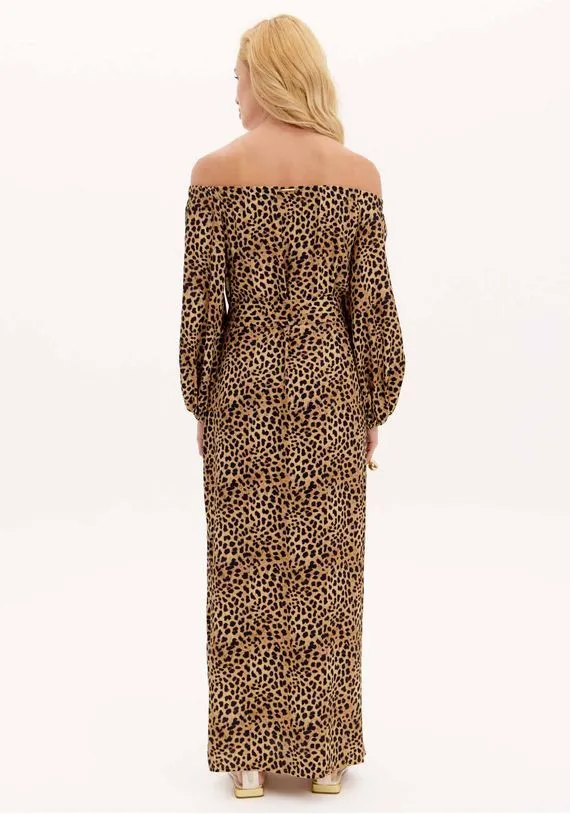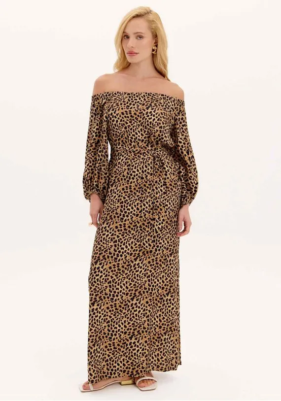 o vestido super midi com estampa animal print é uma aposta sofisticada e repleta de personalidade. acompanha faixa para completar o visual. Aposte!