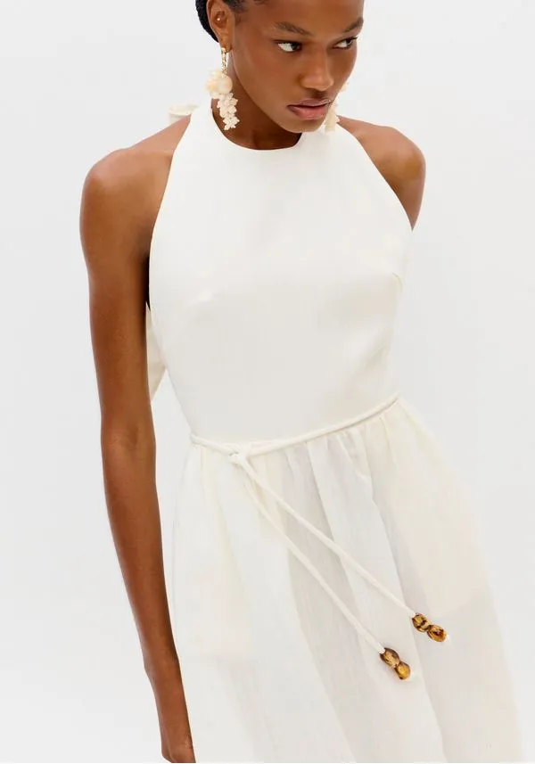 Feito em tecido encorpado com linho, o vestido super midi frente única possui amarração posterior, costas abertas e caimento solto. A barra assimétrica com recorte em tom diferenciado se destaca, trazendo um toque de tendência ao look. Acompanha cinto