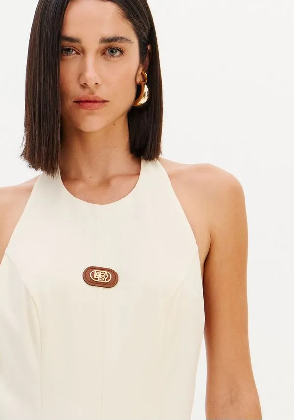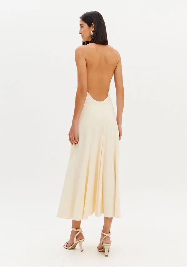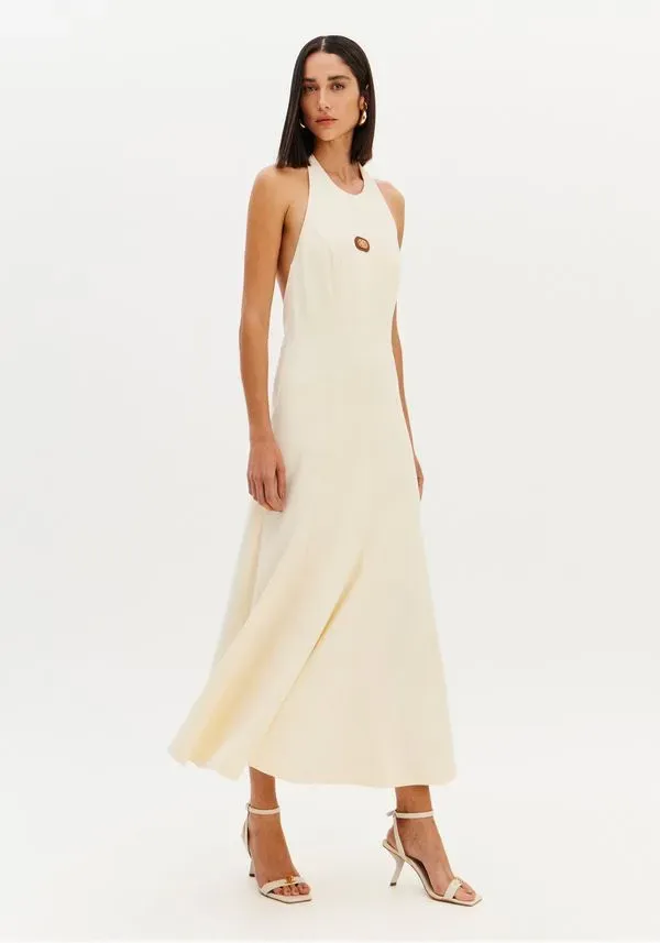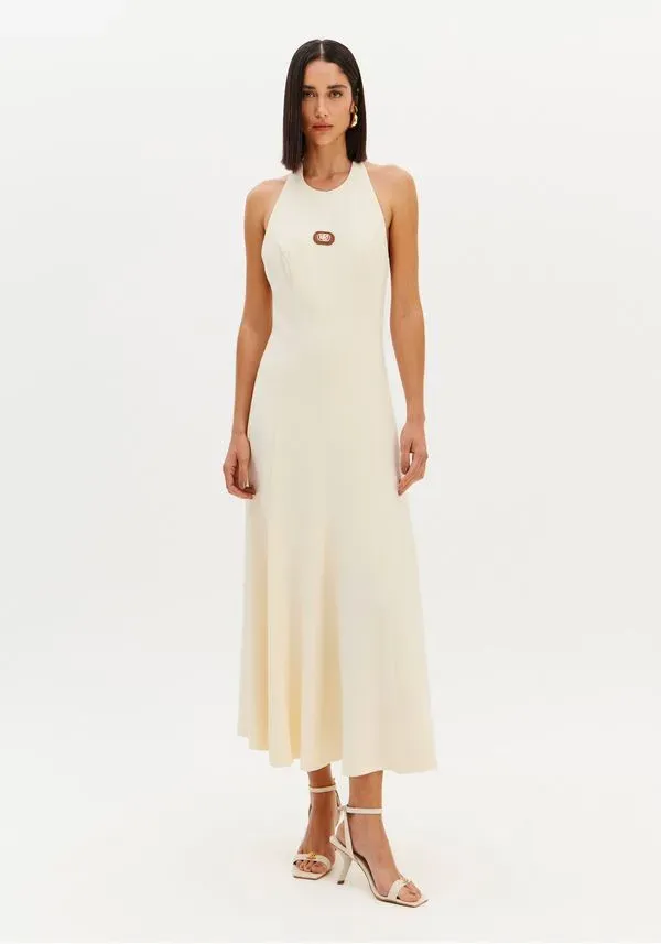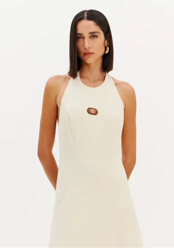 vestido super midi frente única com design elegante e atemporal. A modelagem fluida valoriza o movimento, enquanto o decote halter destaca os ombros e alonga a silhueta. O recorte profundo nas costas traz sensualidade na medida certa, equilibrando sofisticação e modernidade