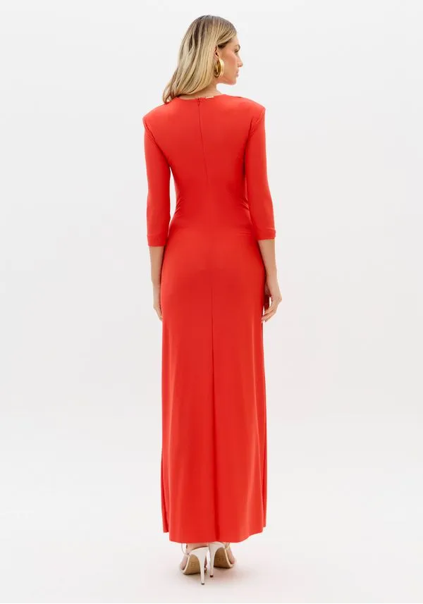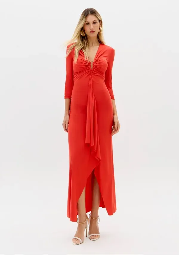O vestido super midi confeccionado em malha conta com caimento justo ao corpo, mangas médias e fechamento posterior por zíper. Seu decote em v com aviamento metálico forma franzidos elegantes na região do busto. Escolha certa para elevar suas produções!