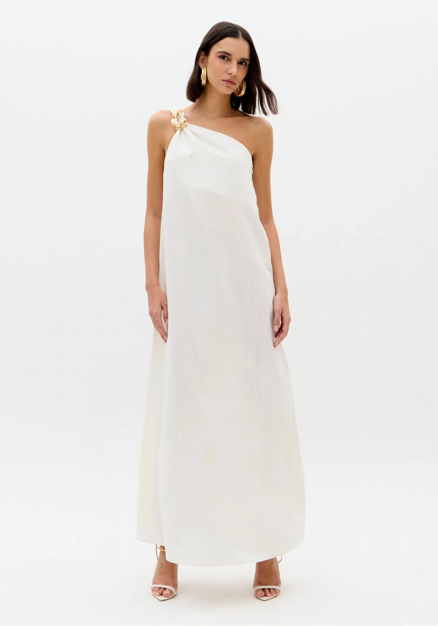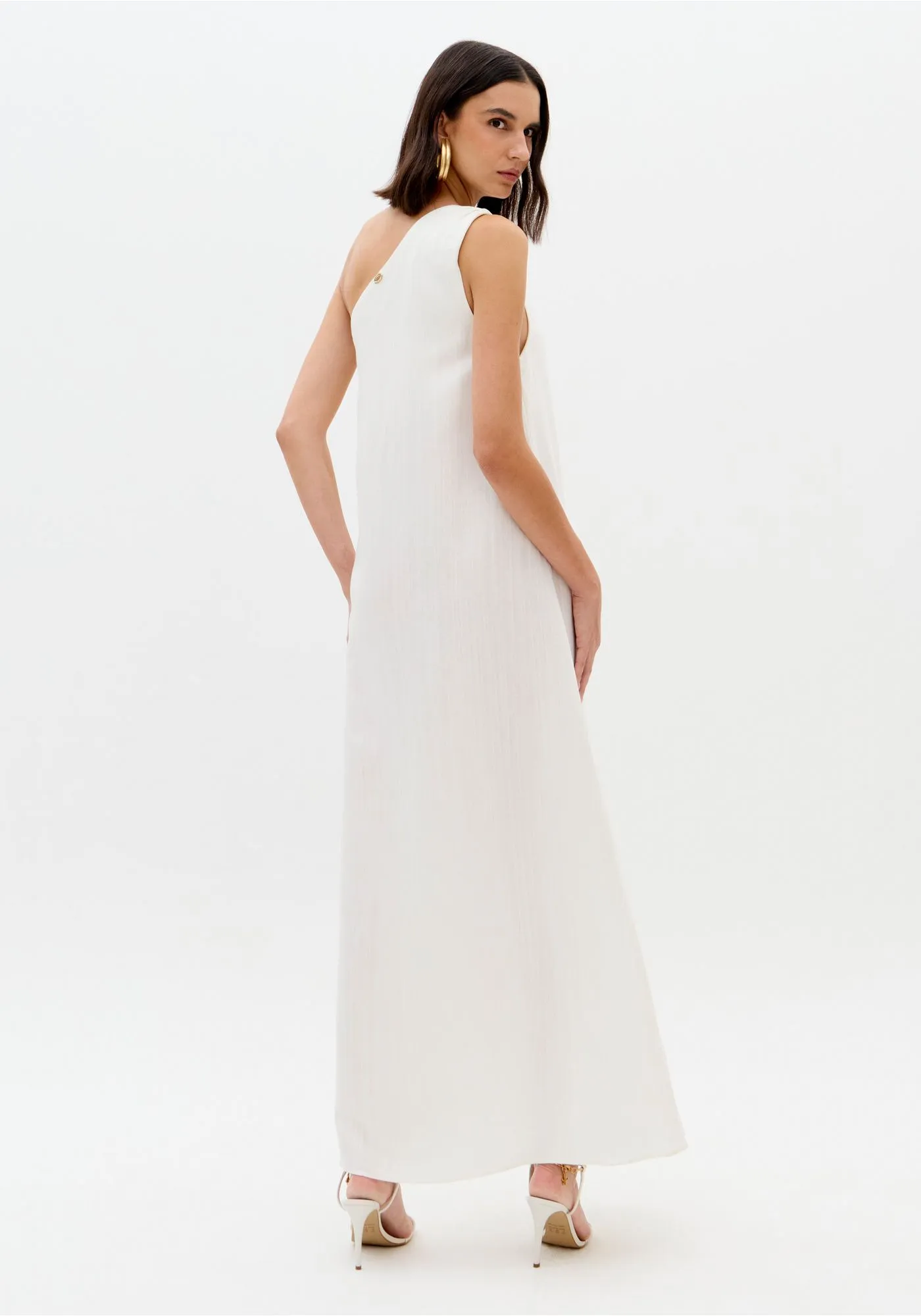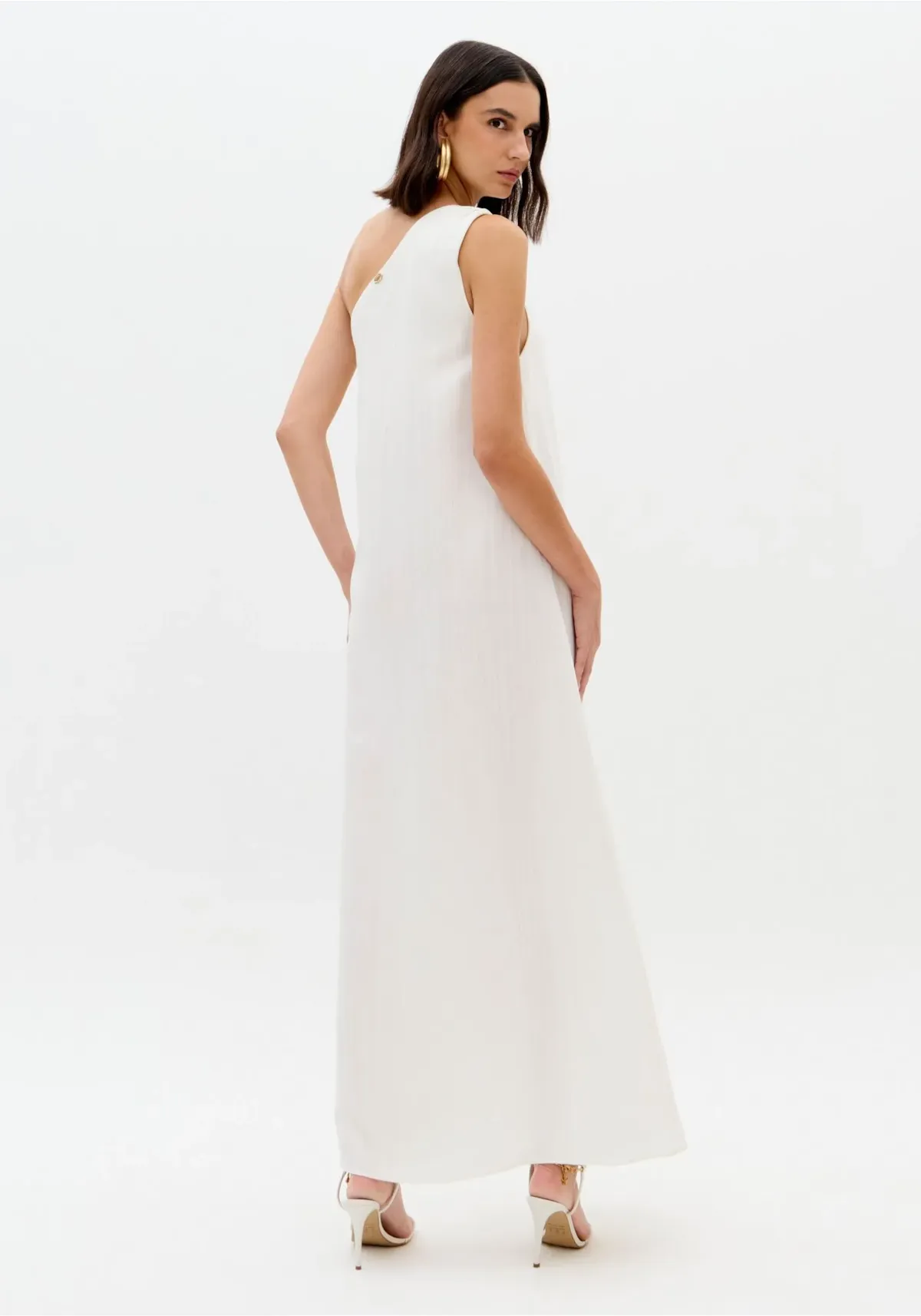 O vestido super midi é confeccionado em tecido plano com linho na composição. Com modelagem de um ombro só, apresenta caimento solto no corpo e passante metálico na alça, traduzindo sofisticação com leveza. Aposte e surpreenda-se com a elegância!