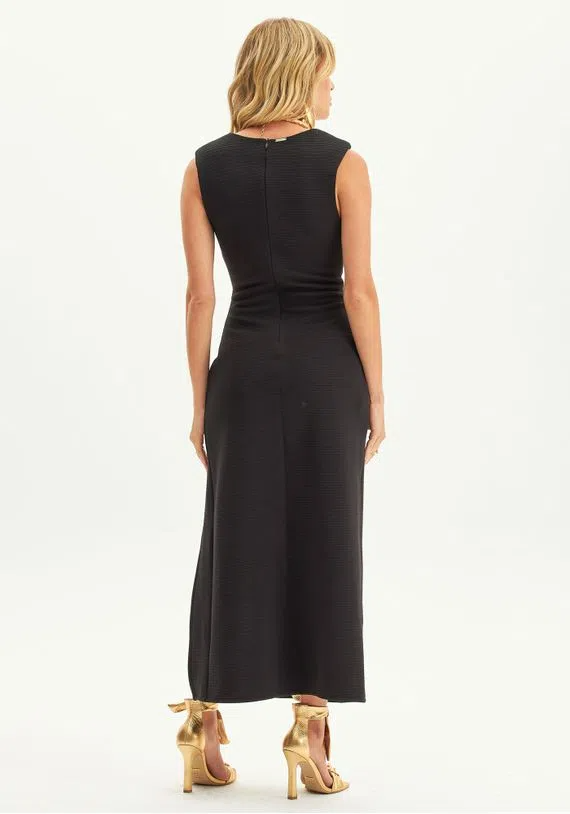 Vestido estruturado com alças largas e decote V. O comprimento midi confere elegância, enquanto a fenda traz sensualidade e movimento a peça. Combine com sandália de salto para um look ainda mais fashion!