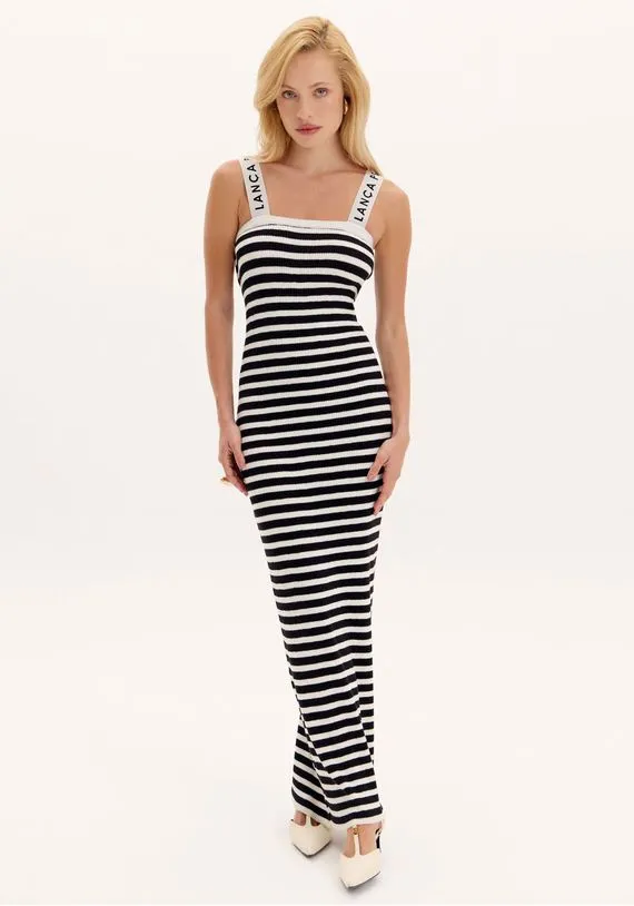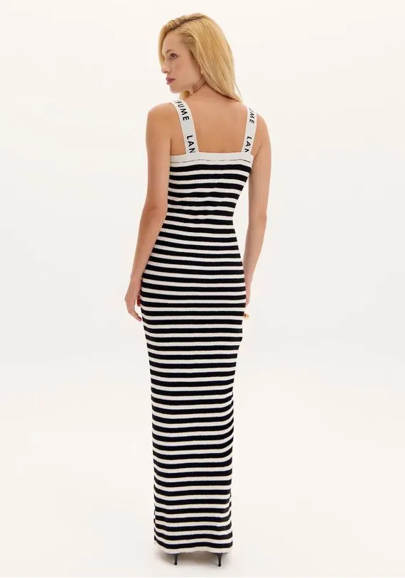 a padronagem listrada do vestido super midi traz um toque moderno e elegante. Com alças personalizadas, é uma peça que une conforto e sofisticação