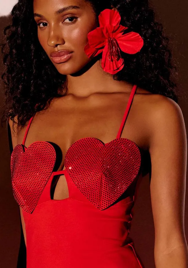 O vestido curto lp possui alças ajustáveis e zíper posterior para um fechamento prático. Os apliques frontais em formato de coração com brilhos conferem charme, destacando seu visual em produções modernas e ultra femininas.