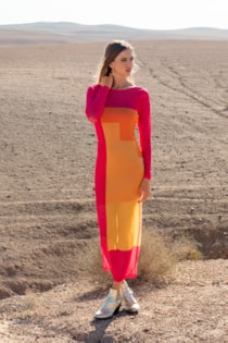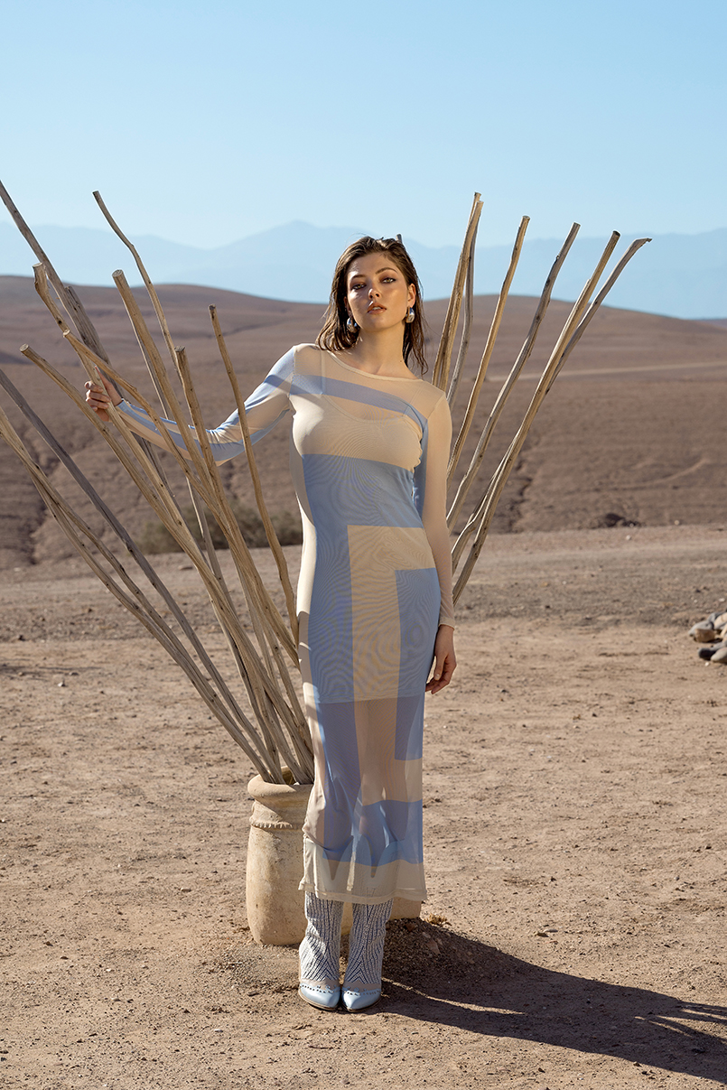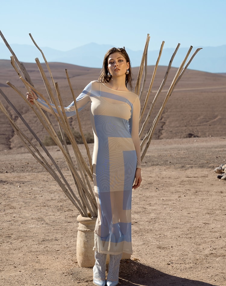 Vestido confecionado em tule elástico estampado. Manga comprida. Decote em V nas costas. Com linning.